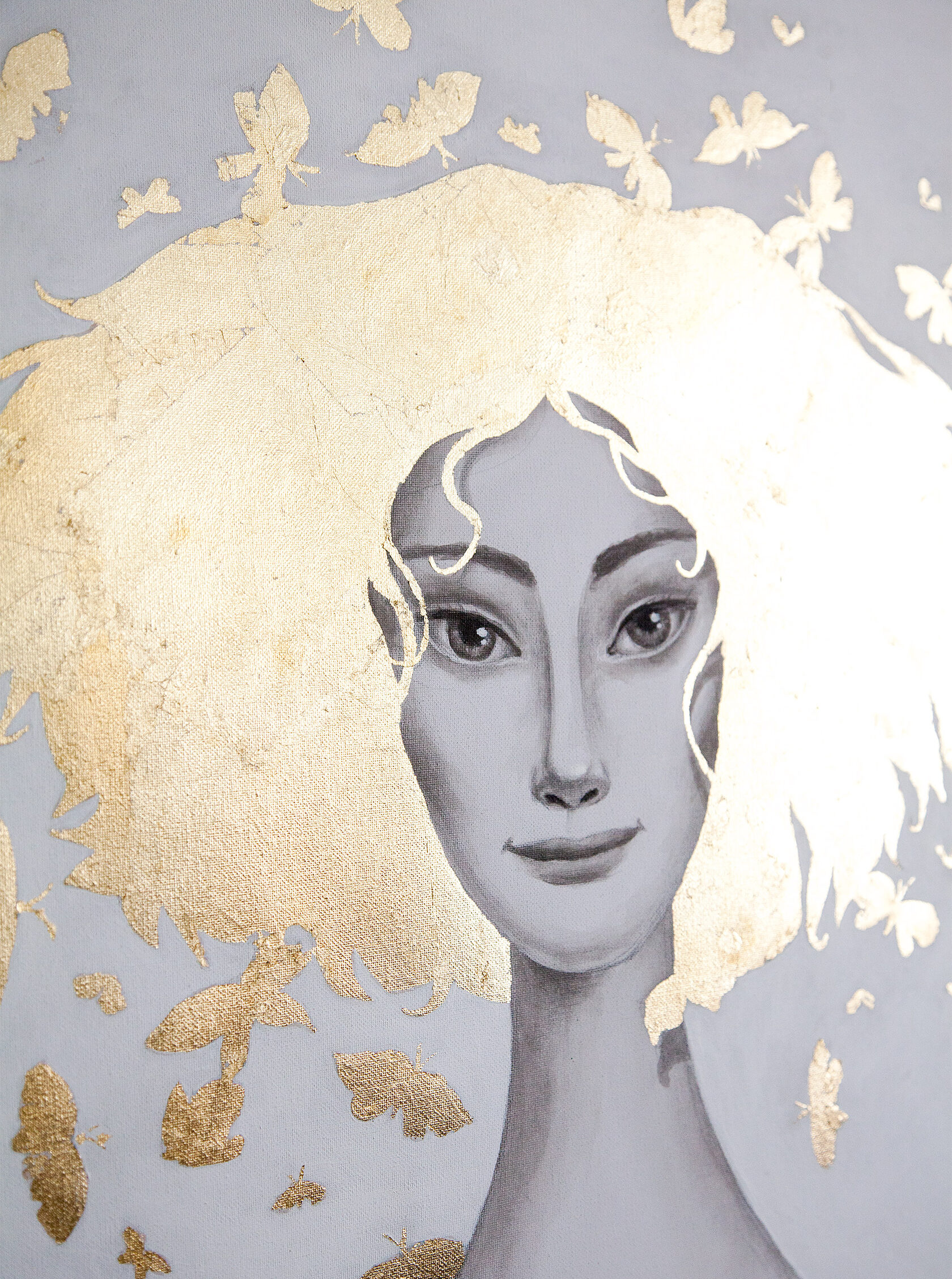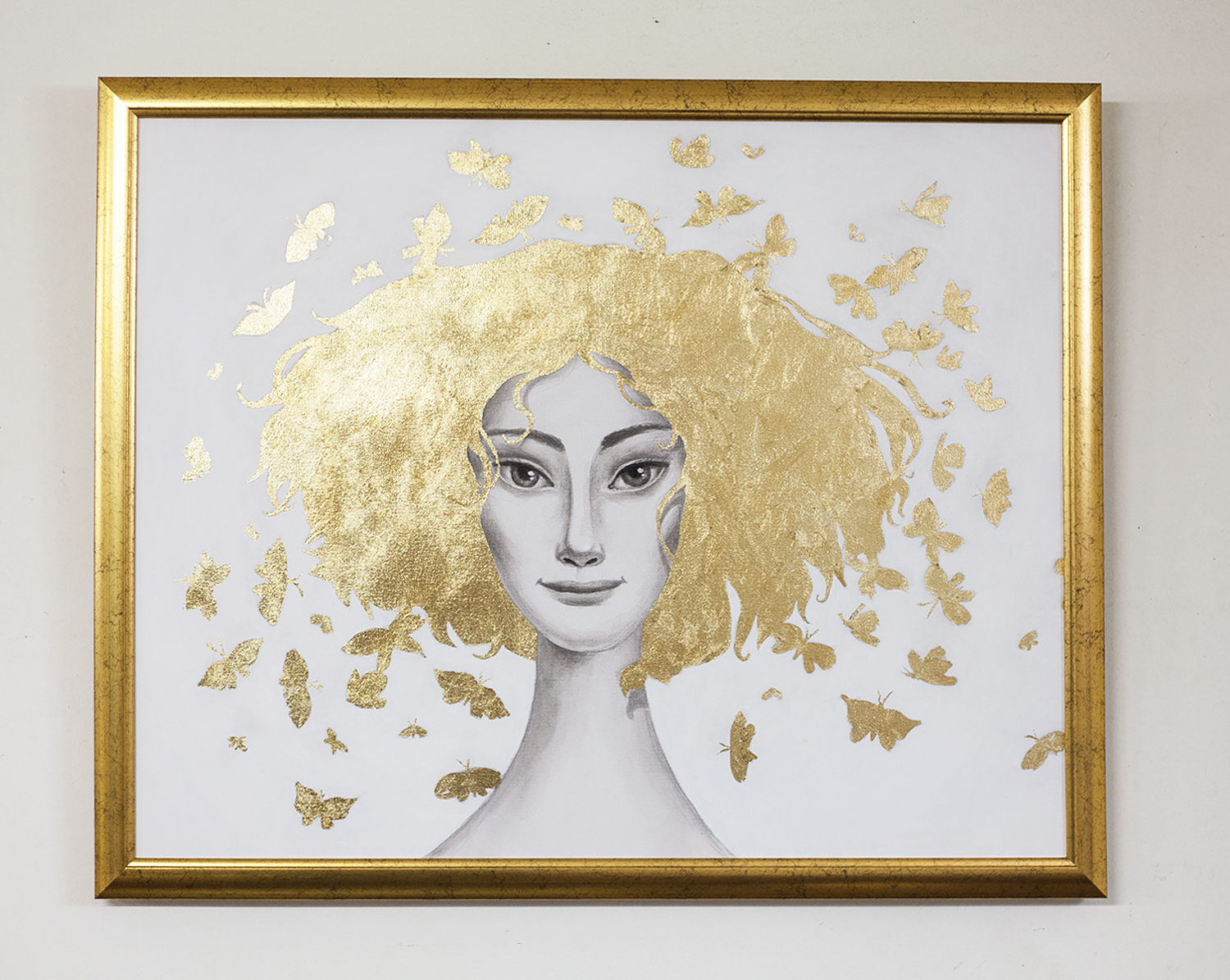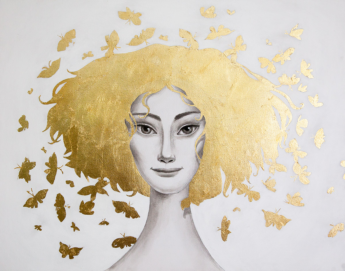 Размер 56х70 см Холст, акрил, золотая поталь Есть бабочки в животе, когда эмоции переполняют, хочется летать, смеяться, плакать от счастья и танцевать одновременно, а здесь бабочки в голове...
