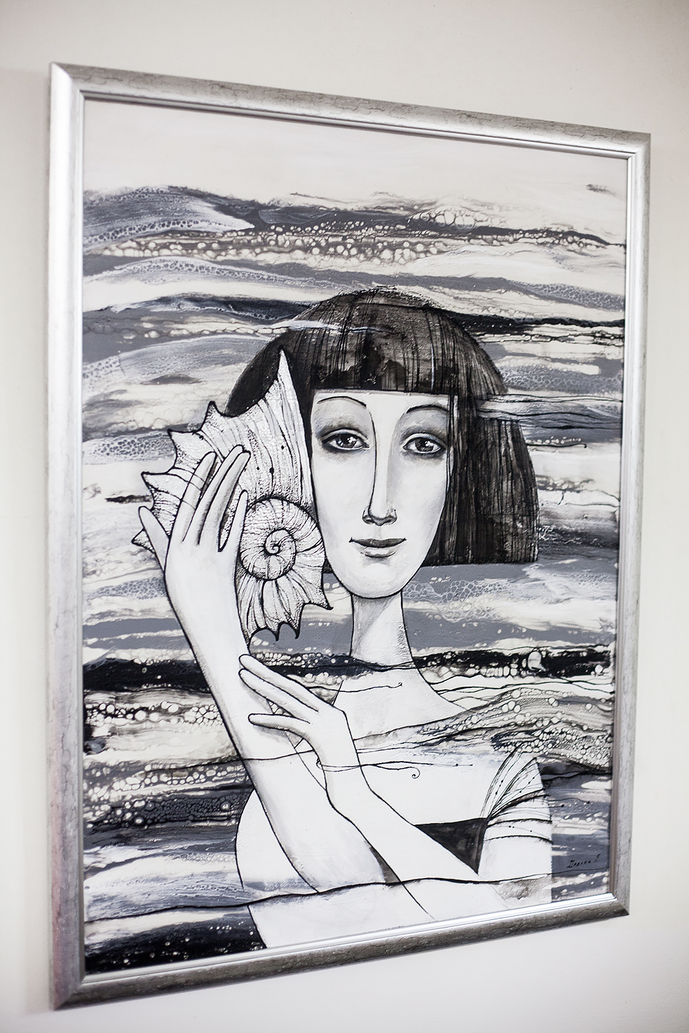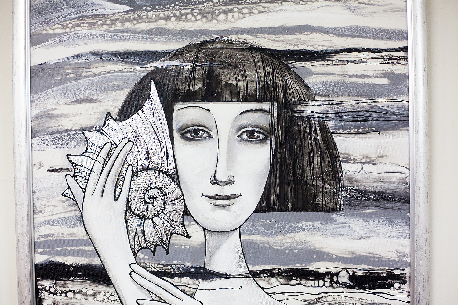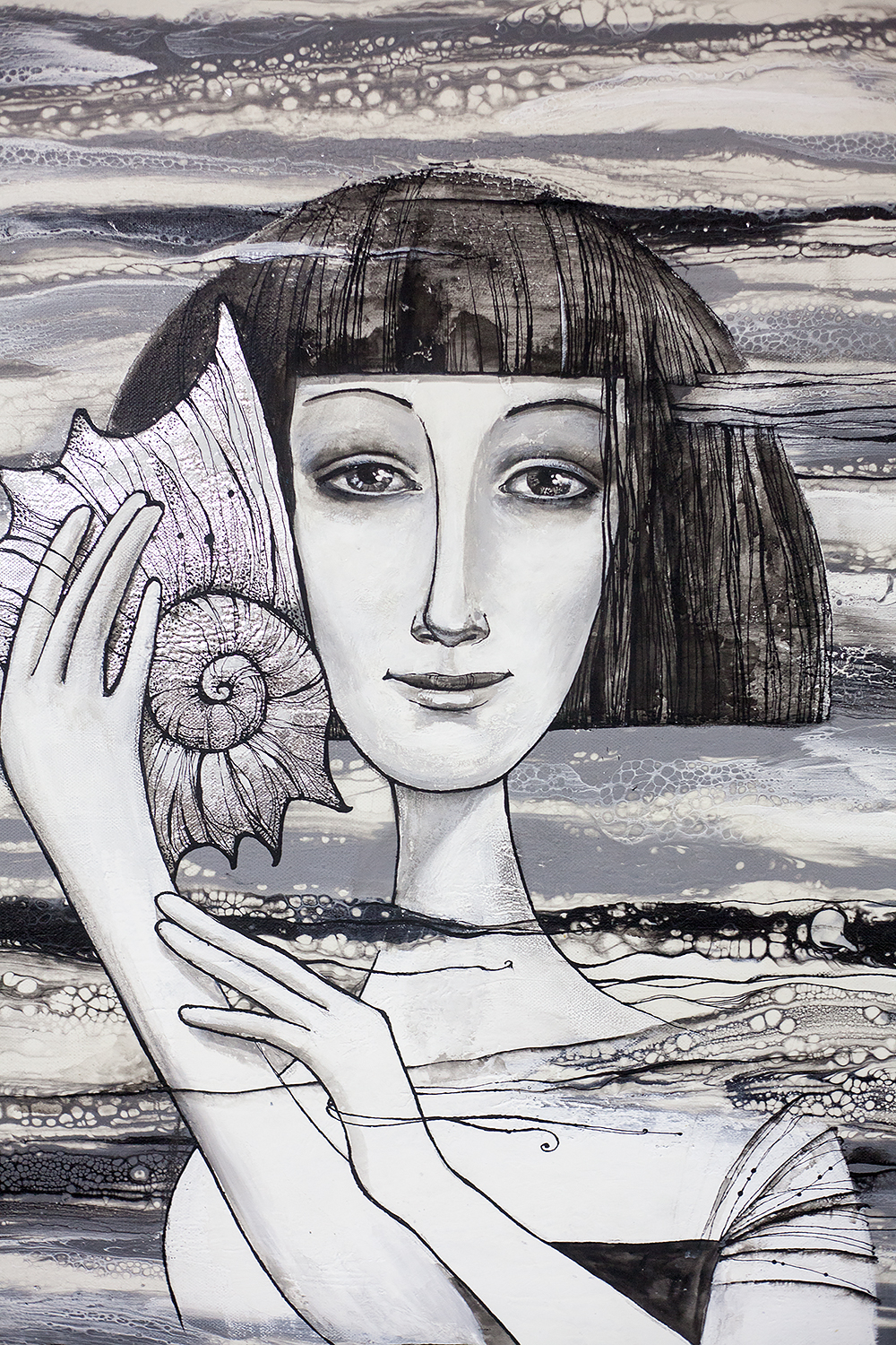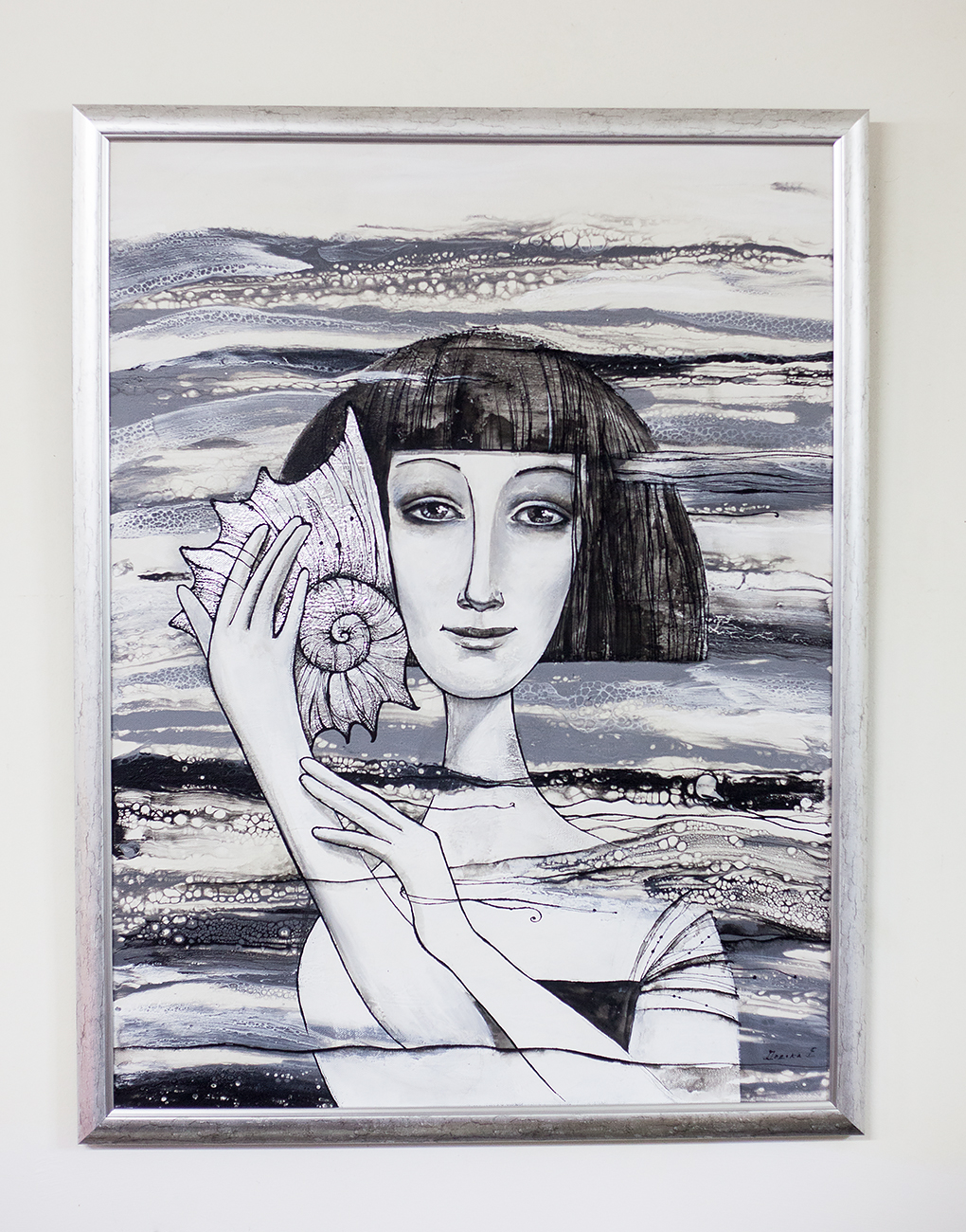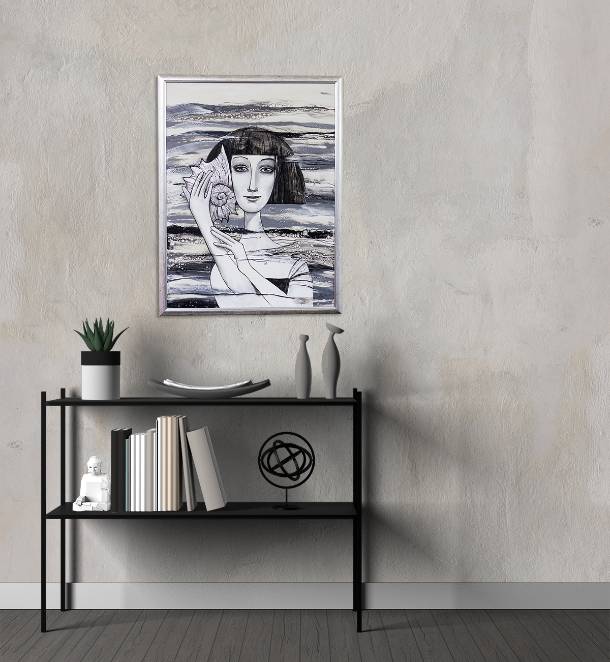 Размер 65*85 см Холст, акрил, поталь Звуки моря... Если ты далеко, но у тебя есть ракушка, то ты близко)) Эта девушка расскажет вам о криках чаек, шуме волн, шуршании песка, свежести морского бриза. Картина выполнена в монохромной гамме с использованием серебряной потали. Оформлена в багет.