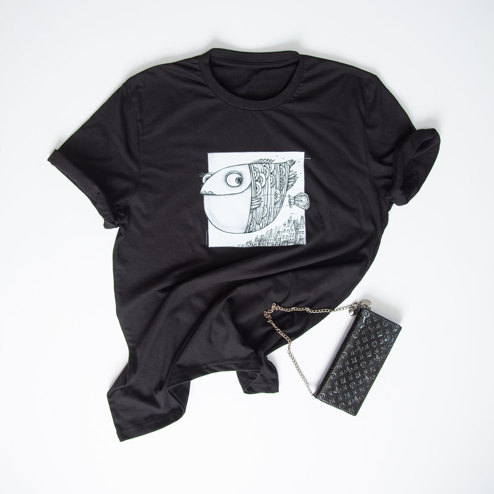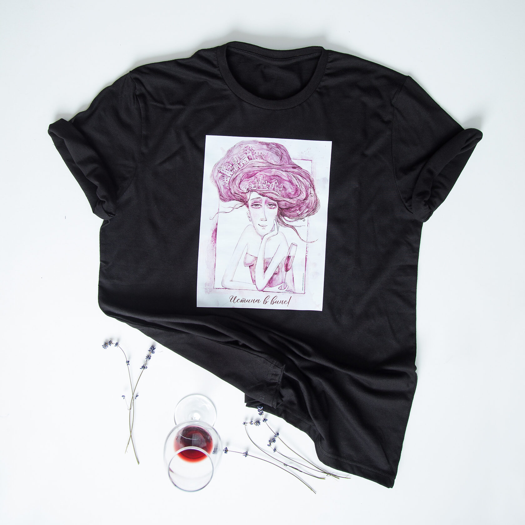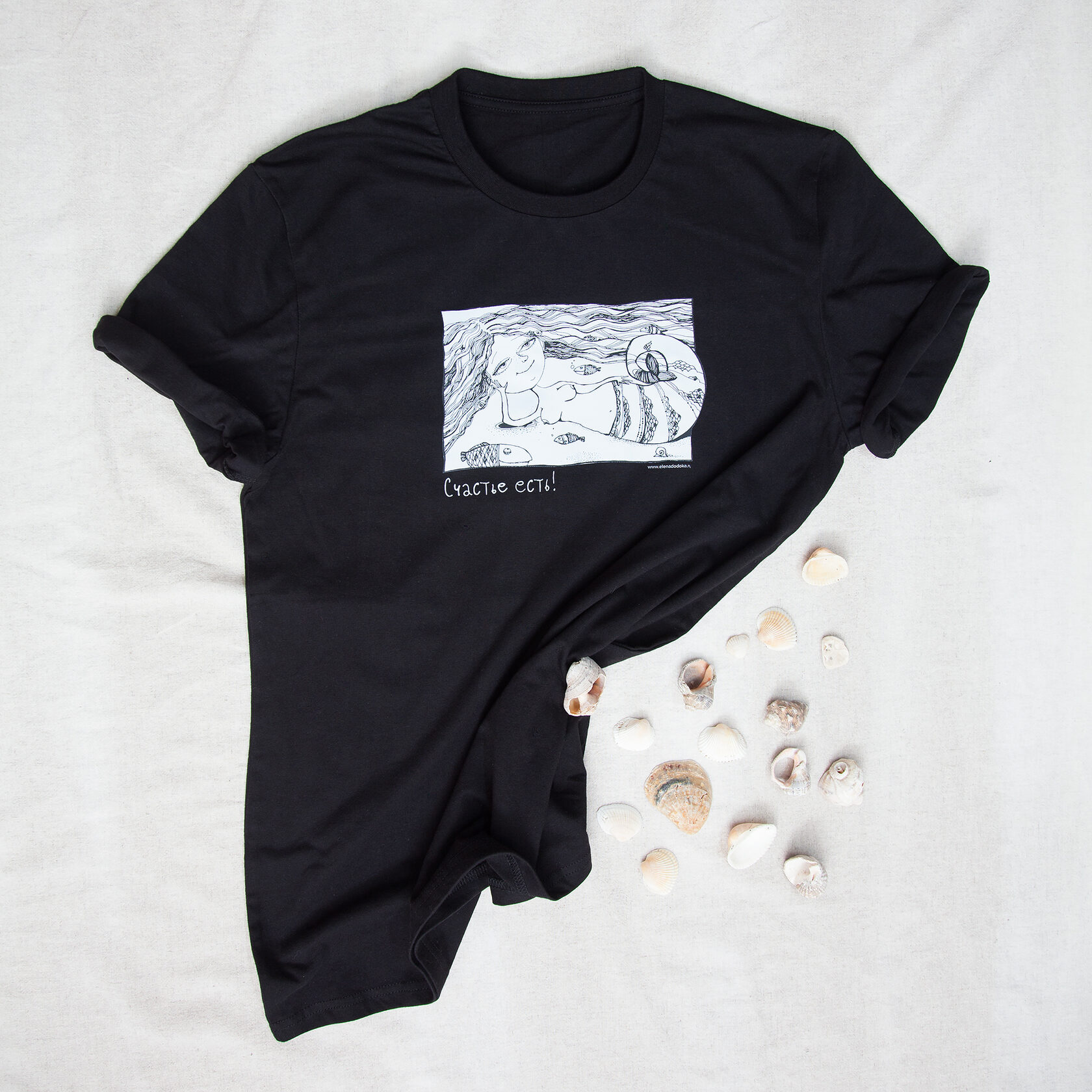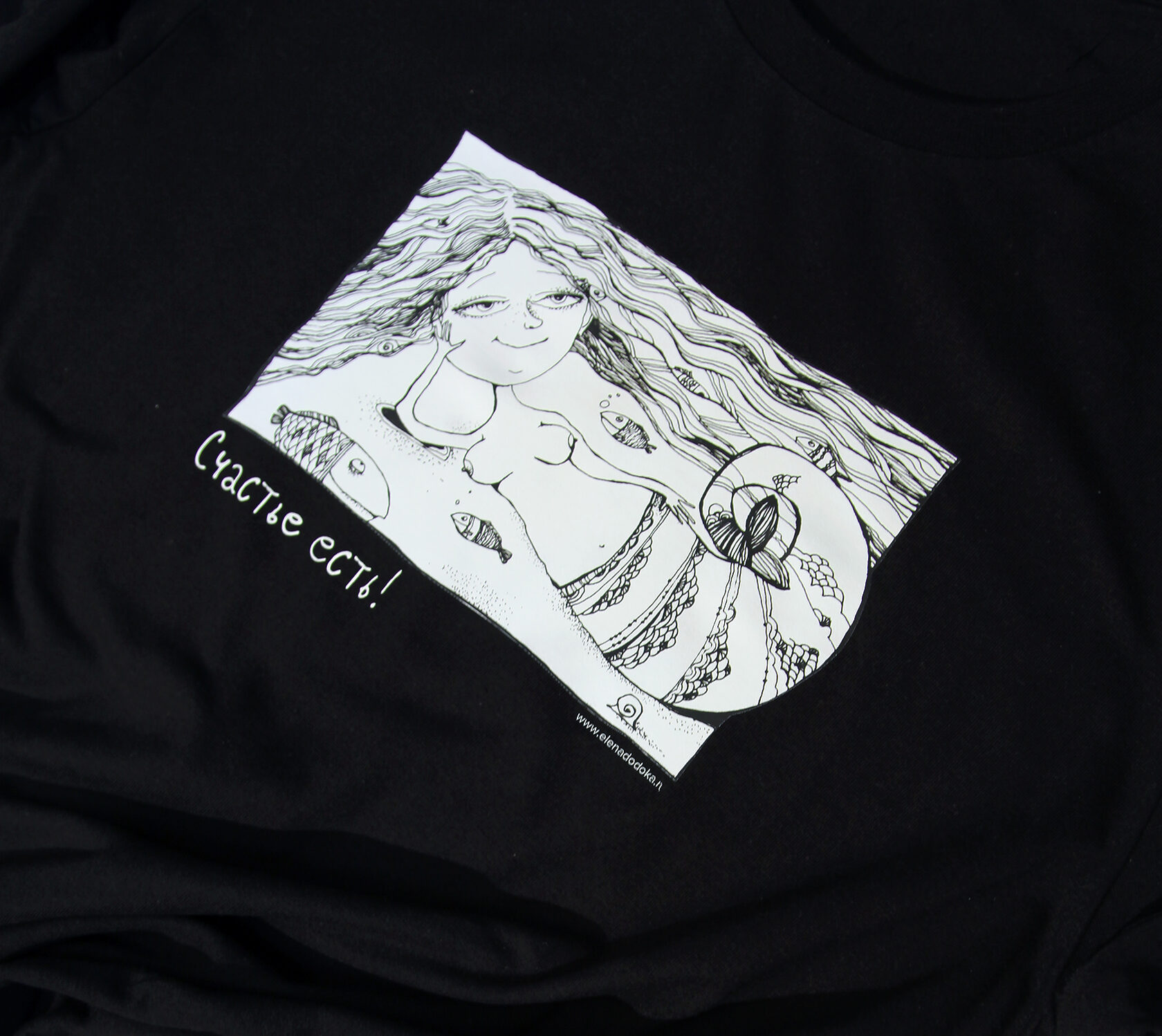 Футболка женская оверсайз (хлопок 100%) с оригнальным принтом, нанесенным на ткань способом DTF печати. Цвет чёрный. В продаже размер L. Если вам нужен другой размер или это изображение вы хотите увидеть на другом цвете футболки, пишите мне — все возможно.