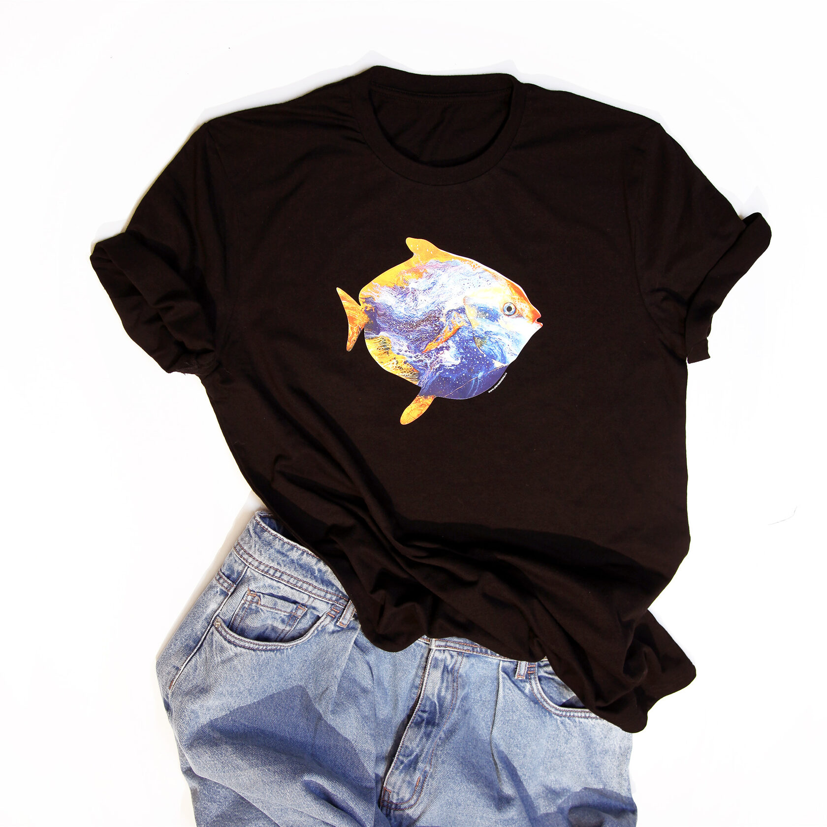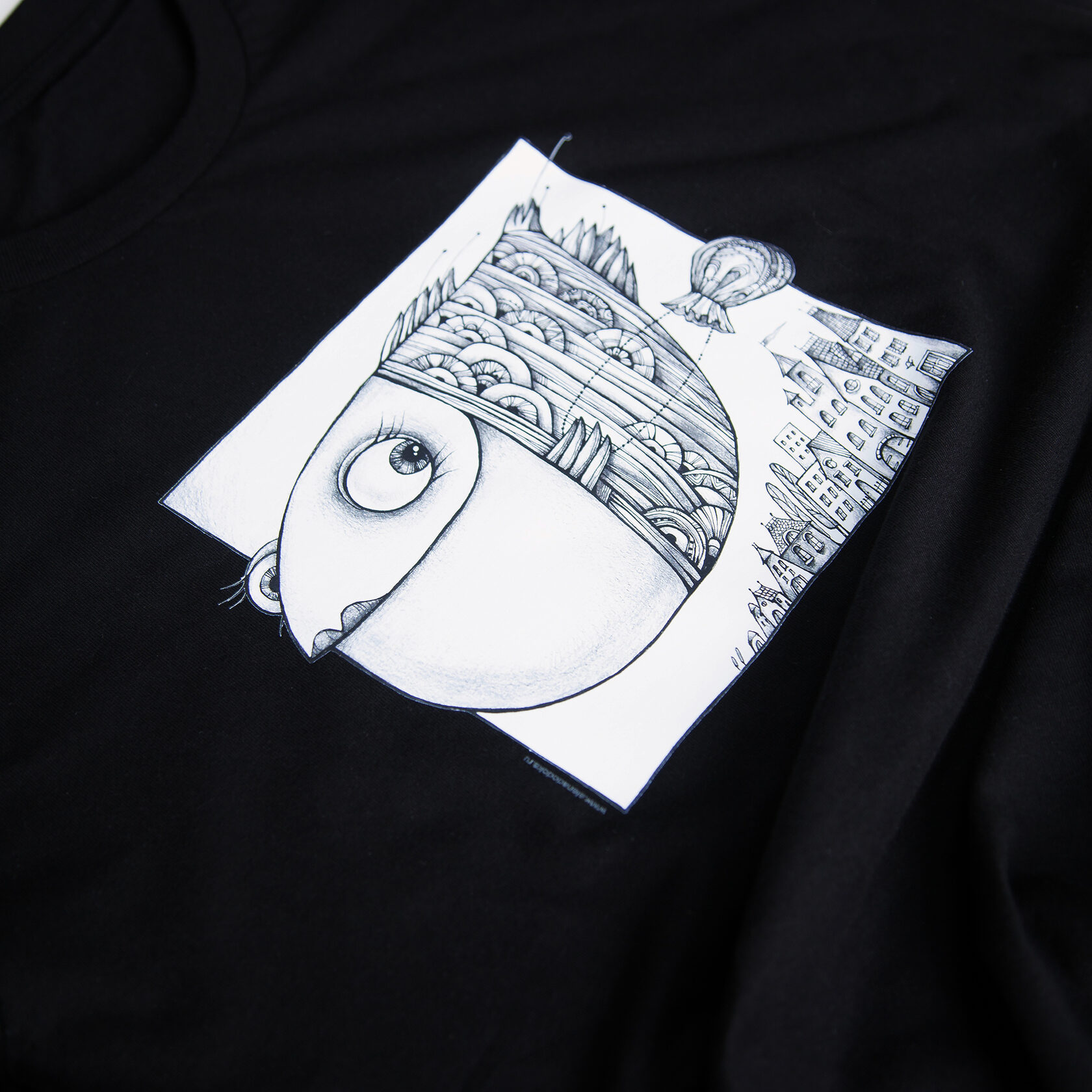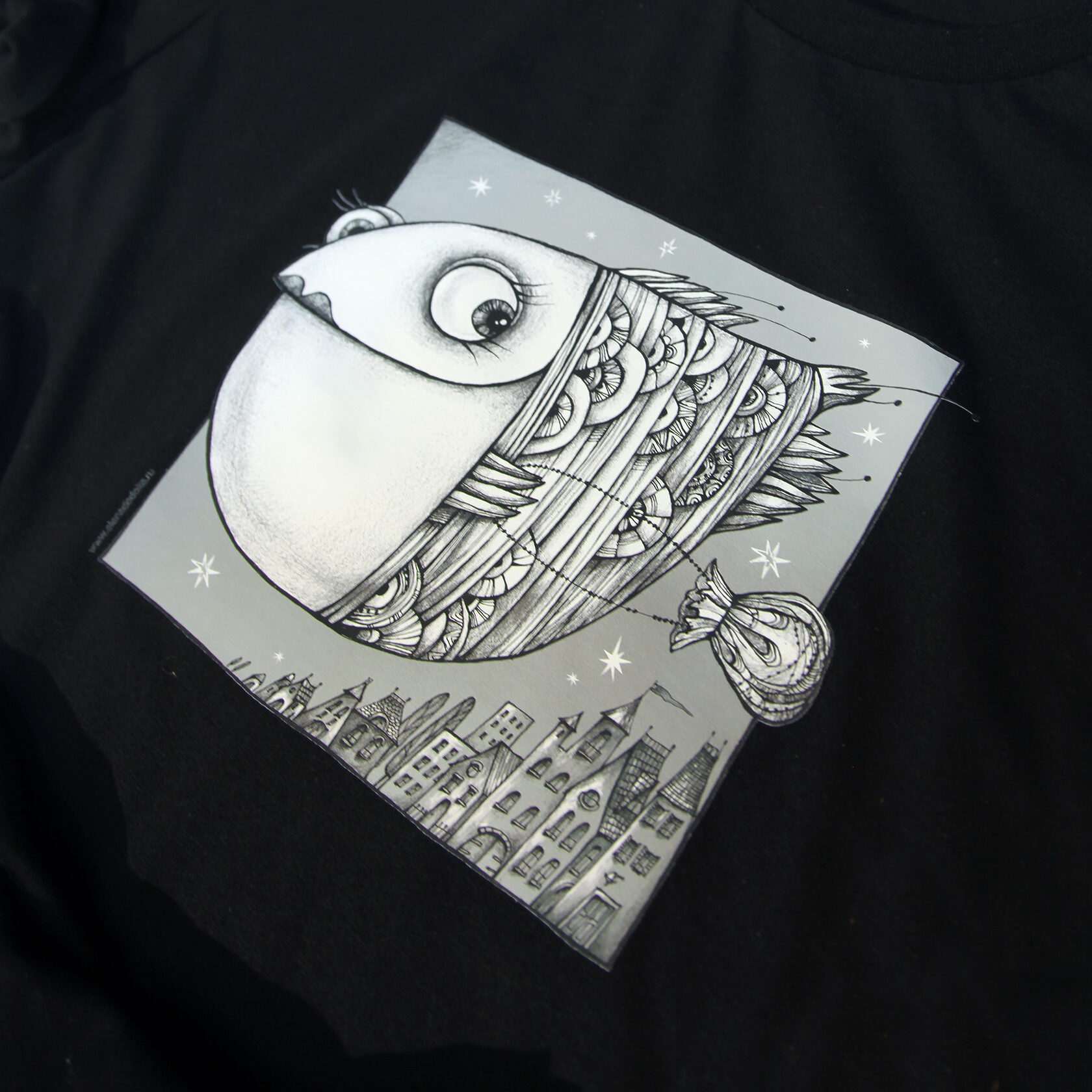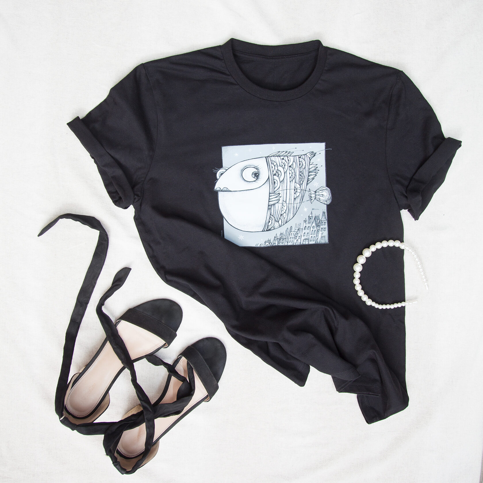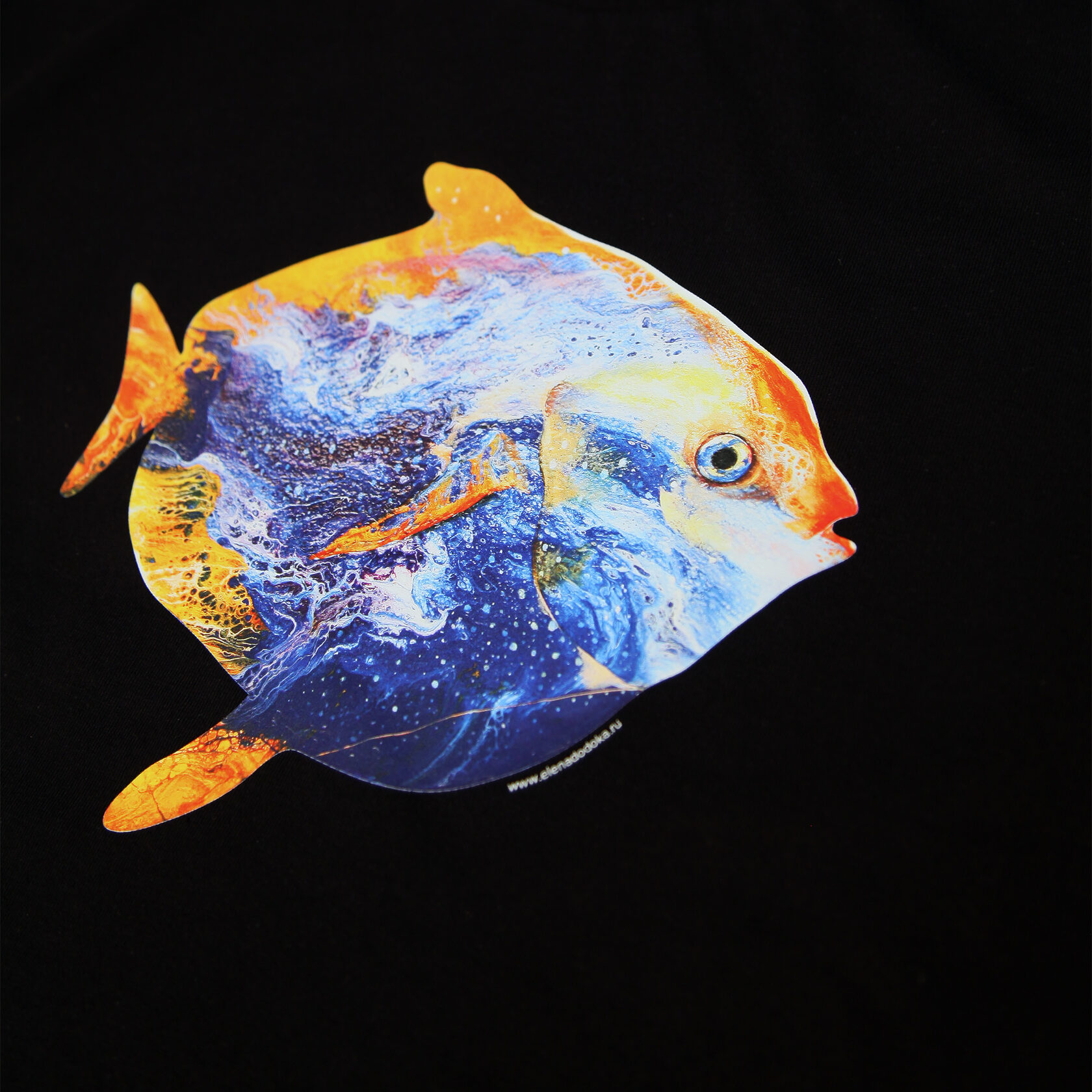 Футболка женская оверсайз (хлопок 100%) с оригнальным принтом, нанесенным на ткань способом DTF печати. Цвет чёрный. В продаже размер L. Если вам нужен другой размер или это изображение вы хотите увидеть на другом цвете футболки, пишите мне — все возможно.