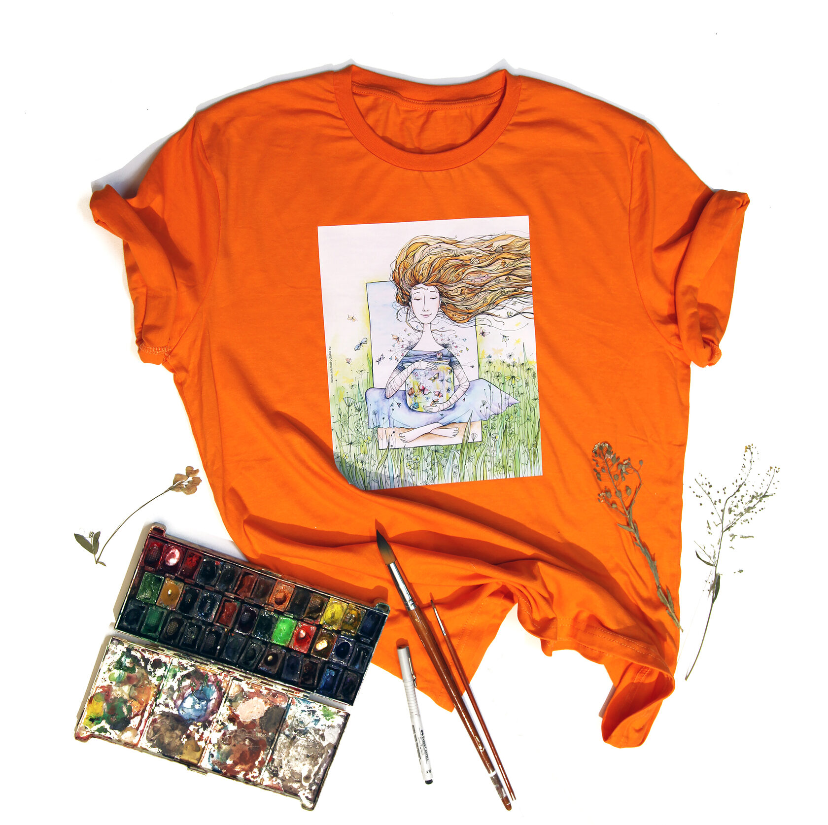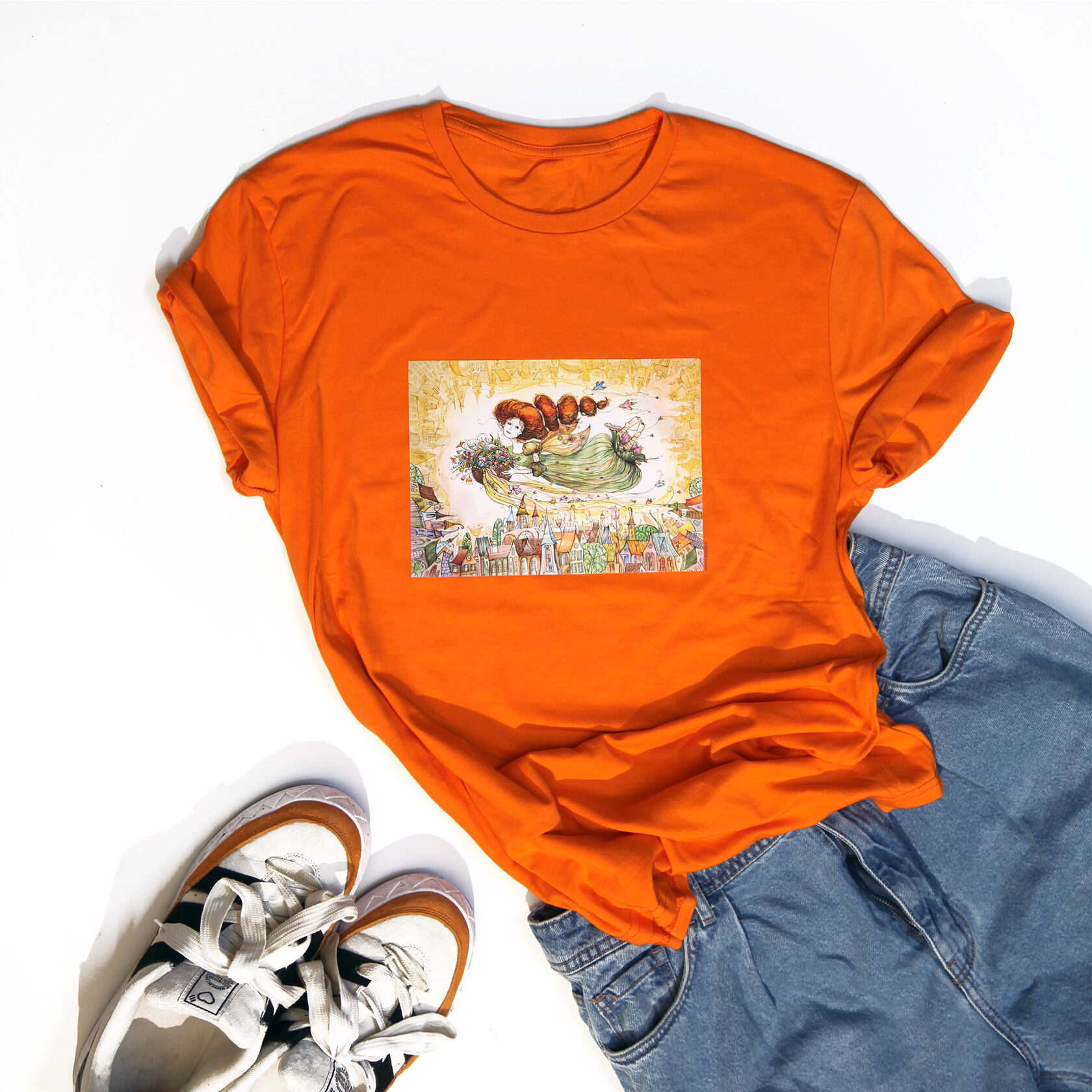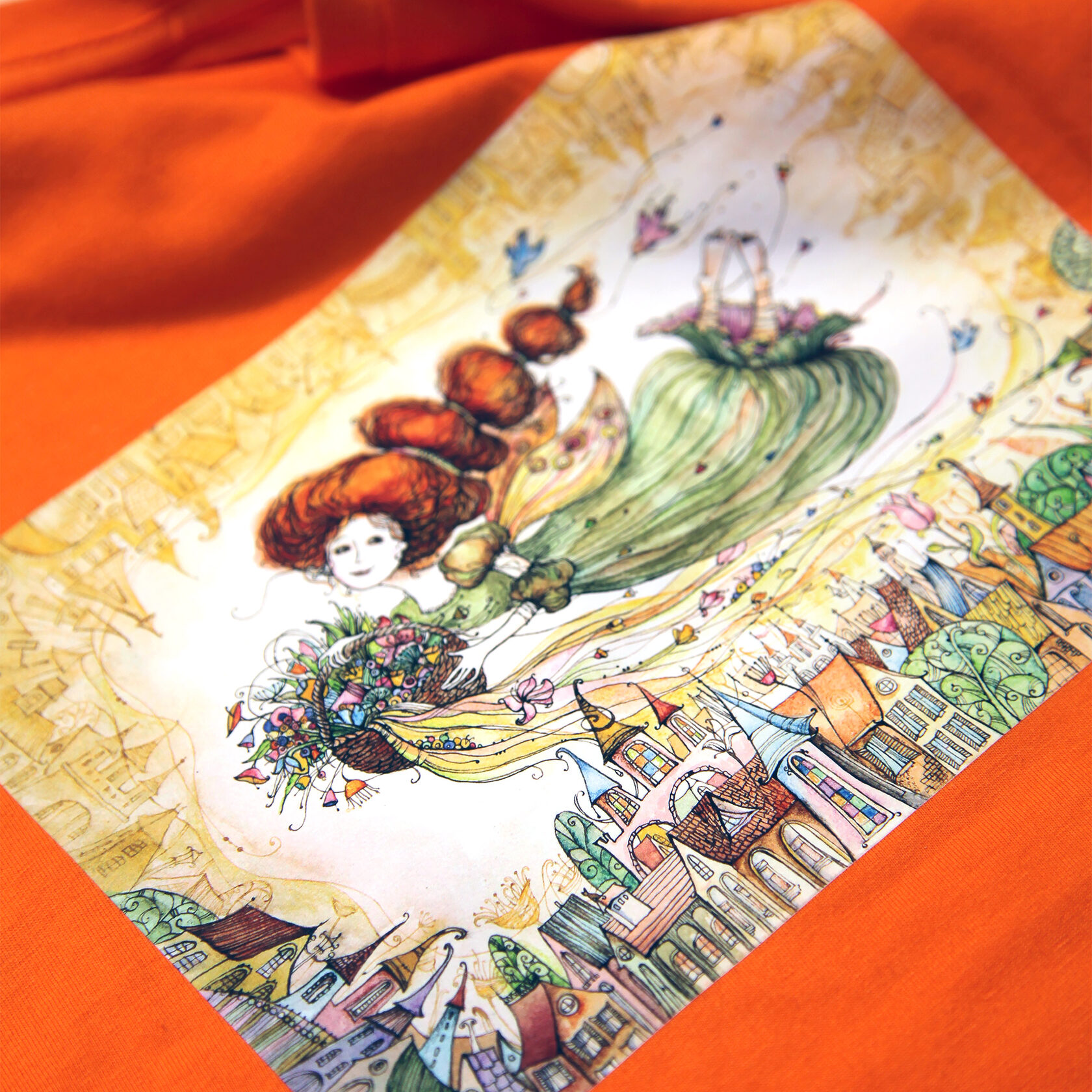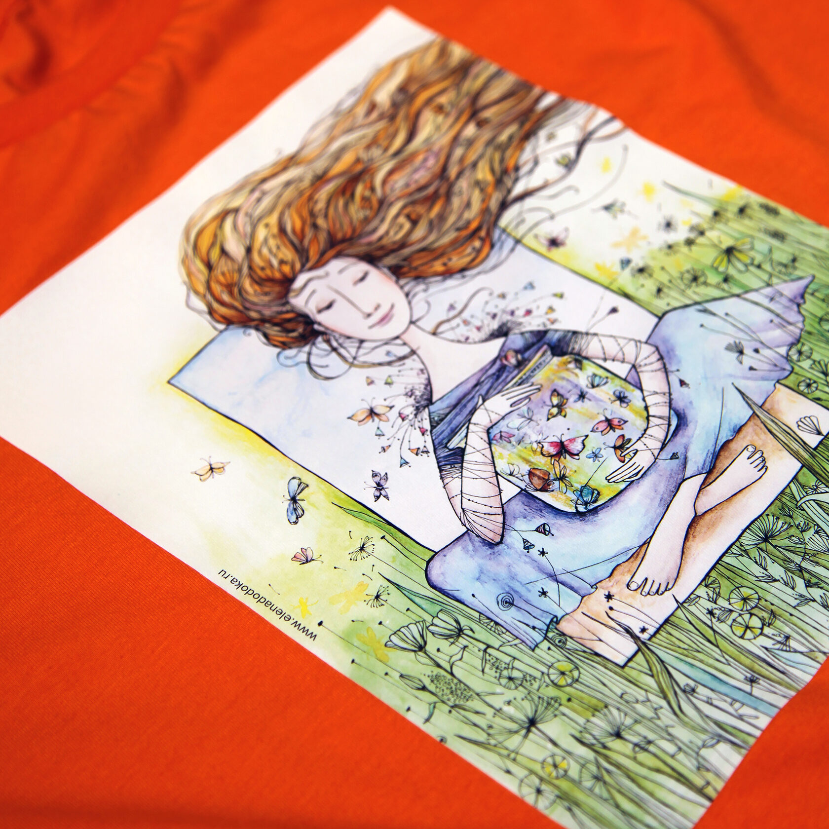 Футболка женская оверсайз (хлопок 100%) с оригнальным принтом, нанесенным на ткань способом DTF печати. Цвет оранжевый. В продаже размер L. Если вам нужен другой размер или это изображение вы хотите увидеть на другом цвете футболки, пишите мне — все возможно.