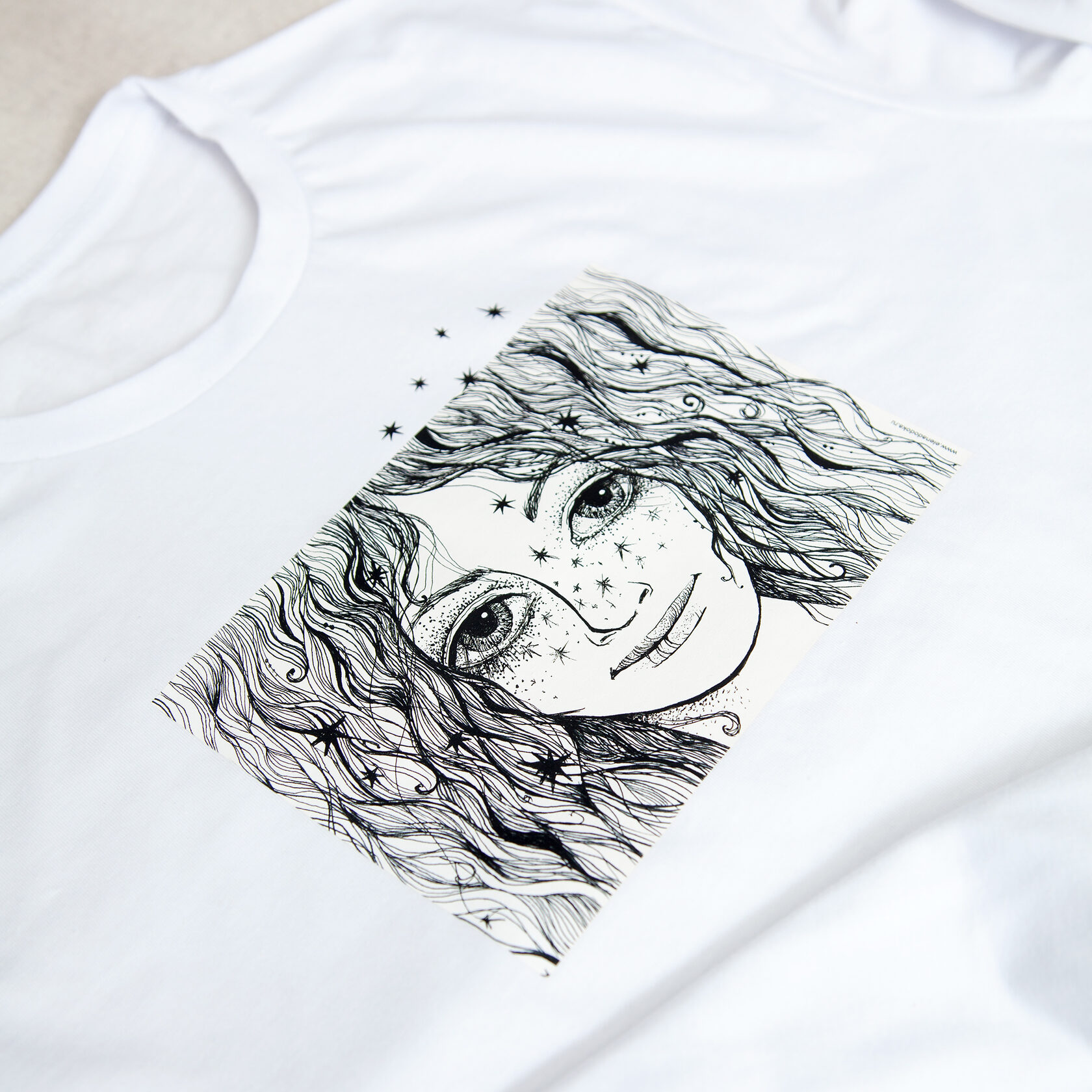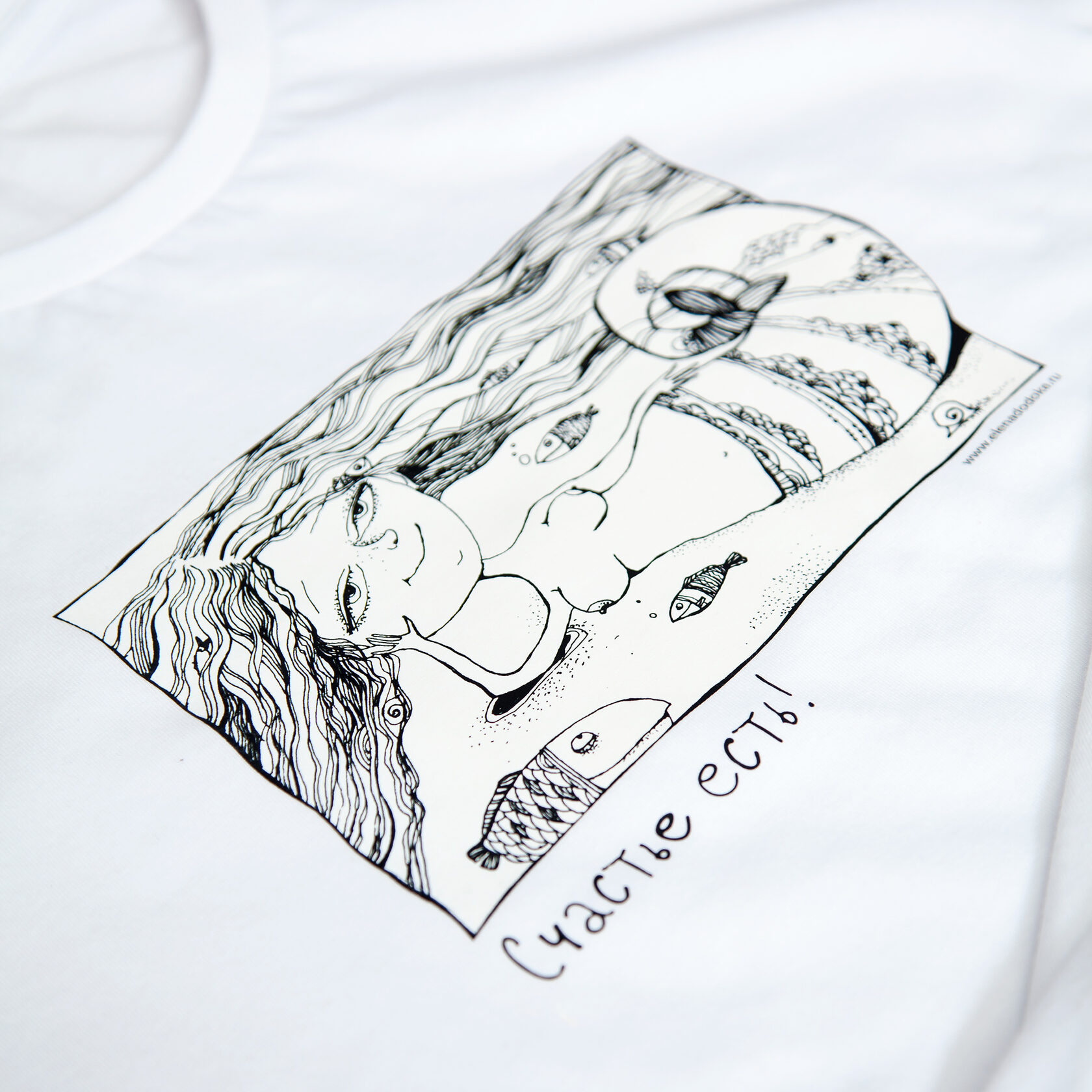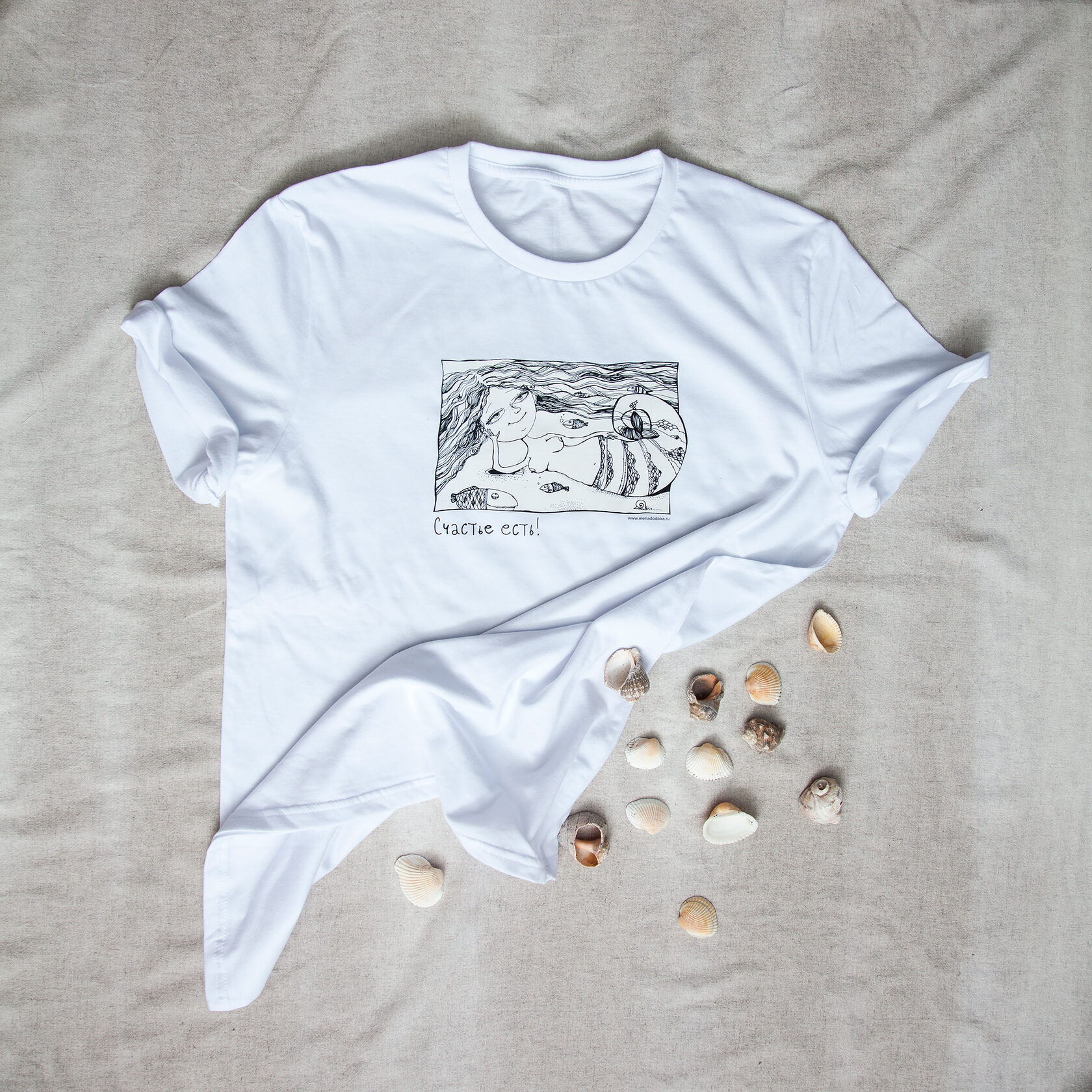 Футболка женская оверсайз (хлопок 100%) с оригнальным принтом, нанесенным на ткань способом DTF печати. Цвет белый. В продаже размер L. Если вам нужен другой размер или это изображение вы хотите увидеть на другом цвете футболки, пишите мне — все возможно!