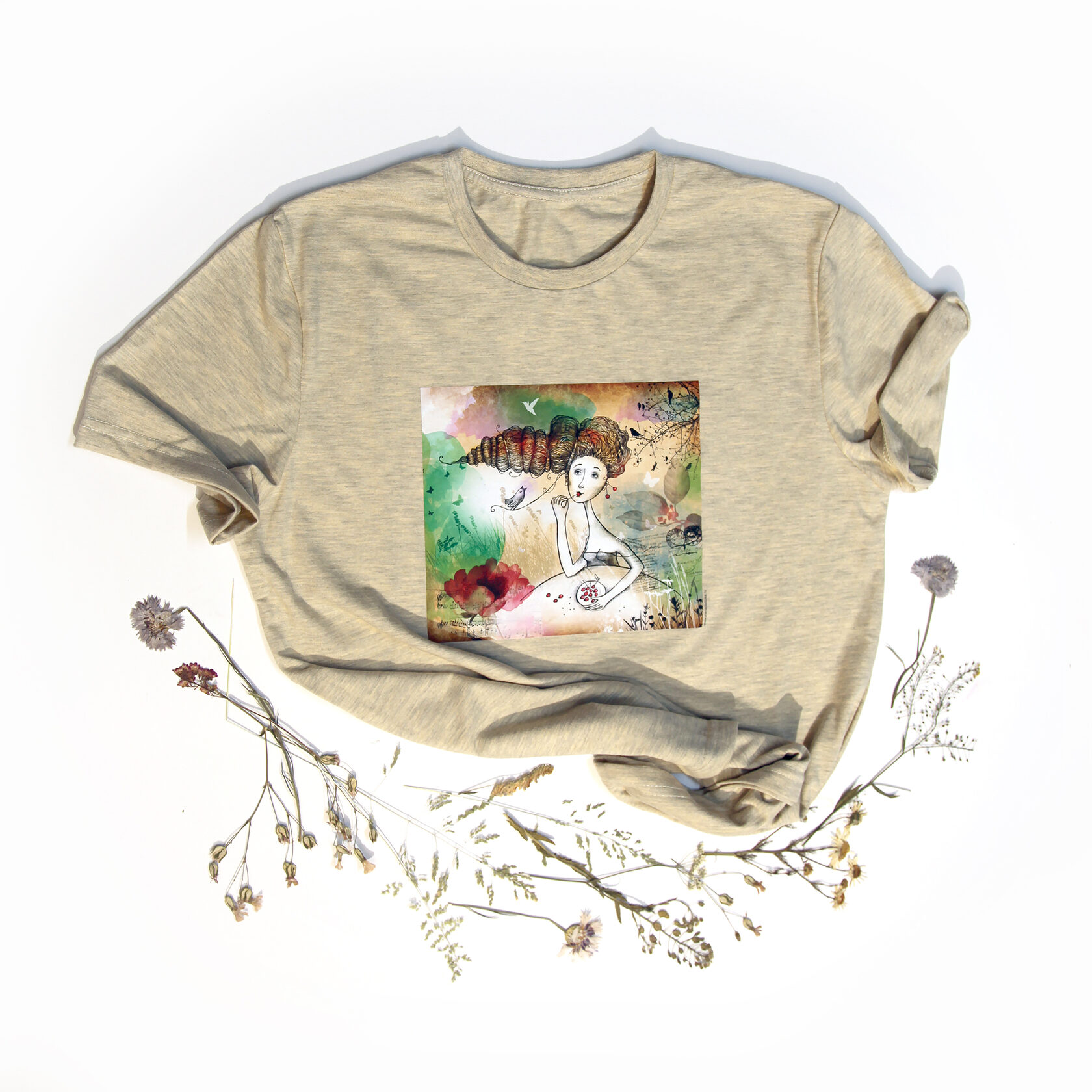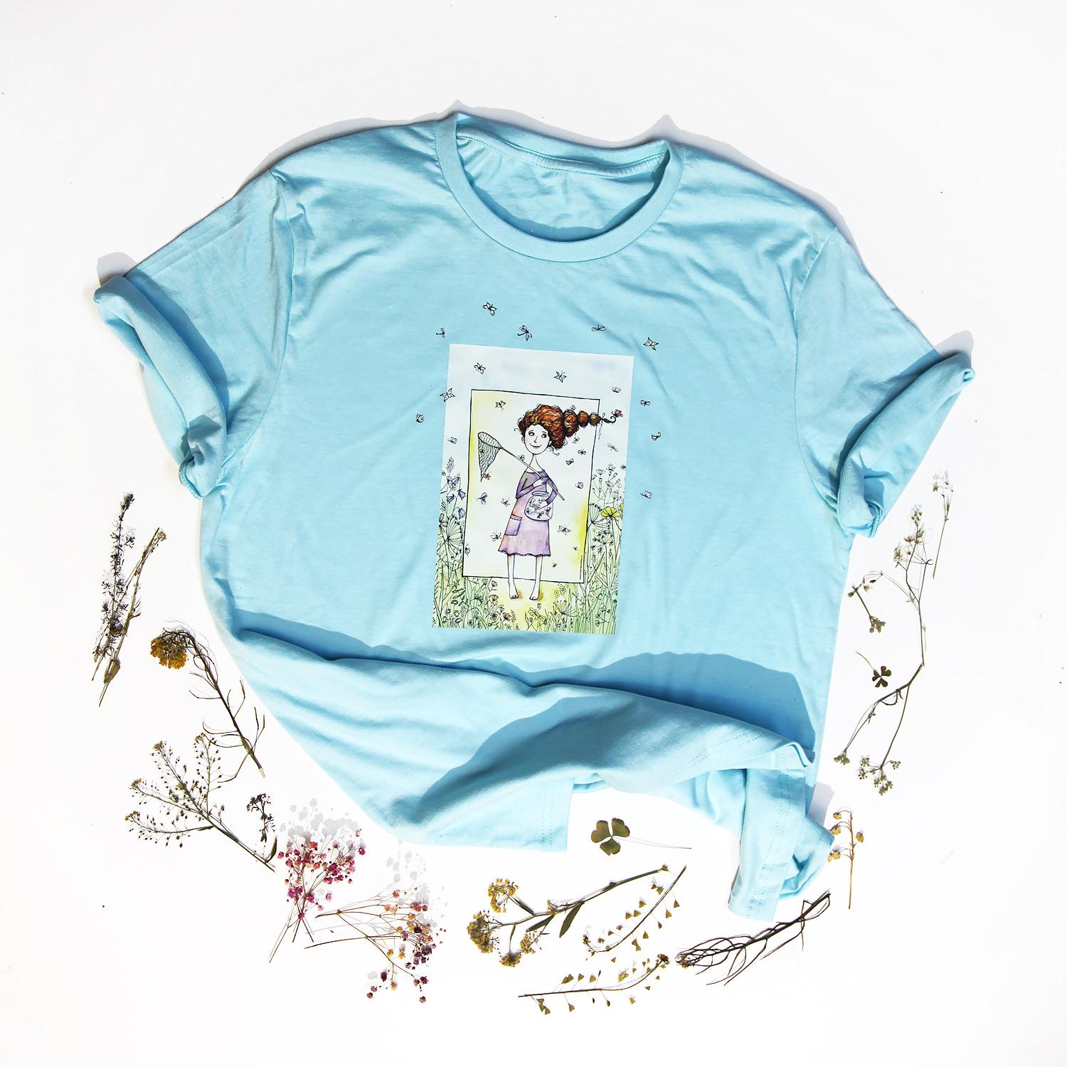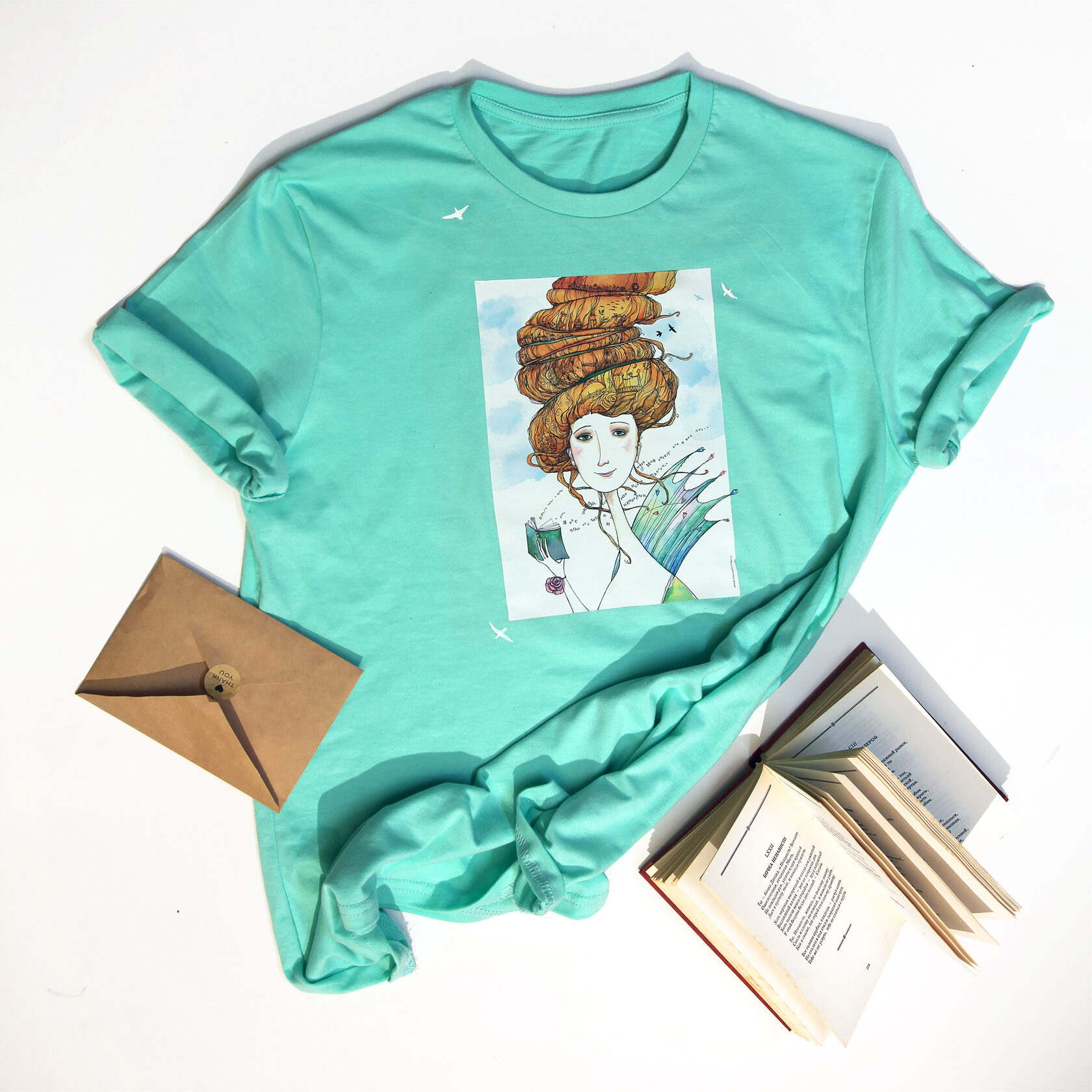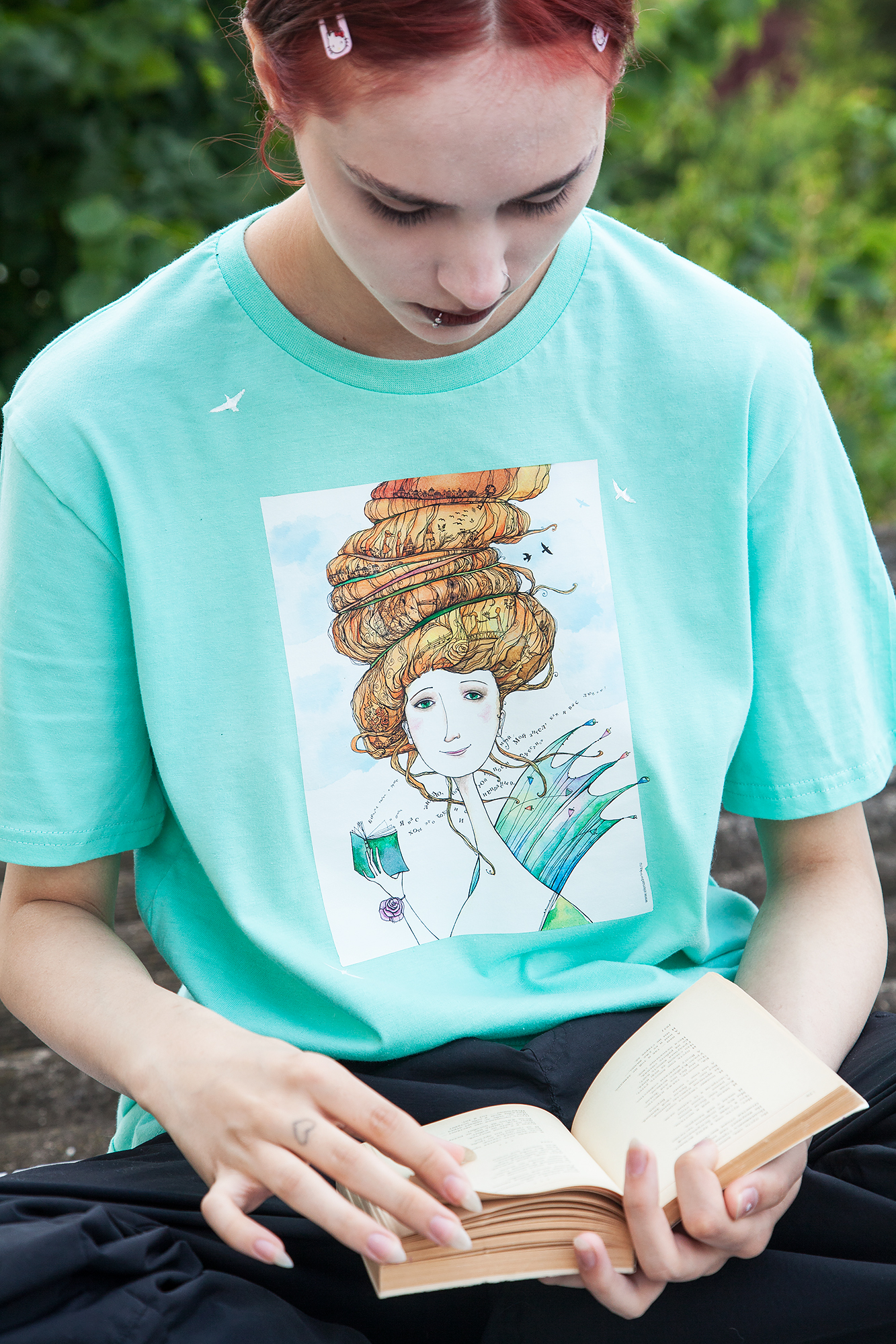 Футболка женская оверсайз (хлопок 100%) с оригнальным принтом, нанесенным на ткань способом DTF печати. Цвет небесный. В продаже размер L. Если вам нужен другой размер или это изображение вы хотите увидеть на другом цвете футболки, пишите мне — все возможно.
