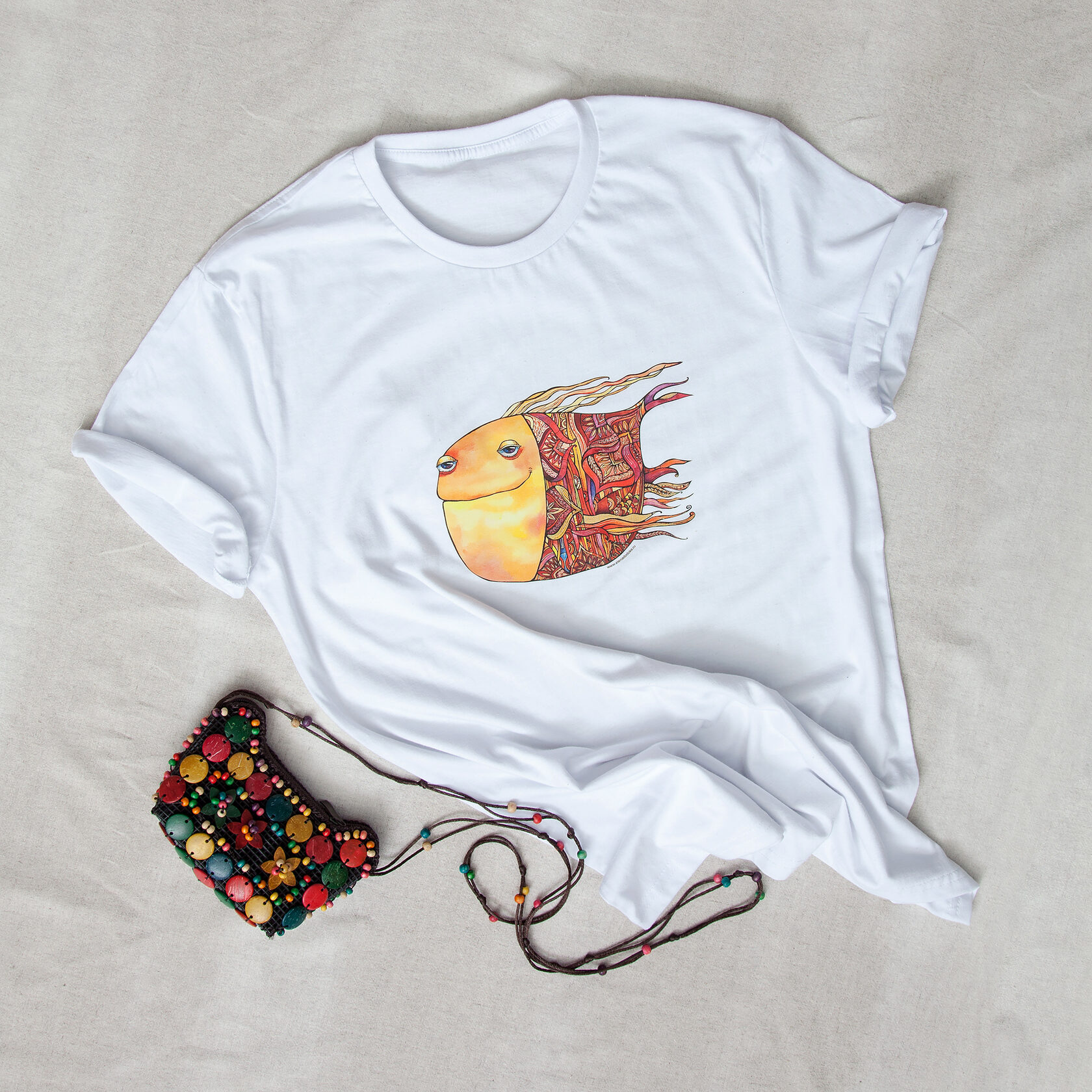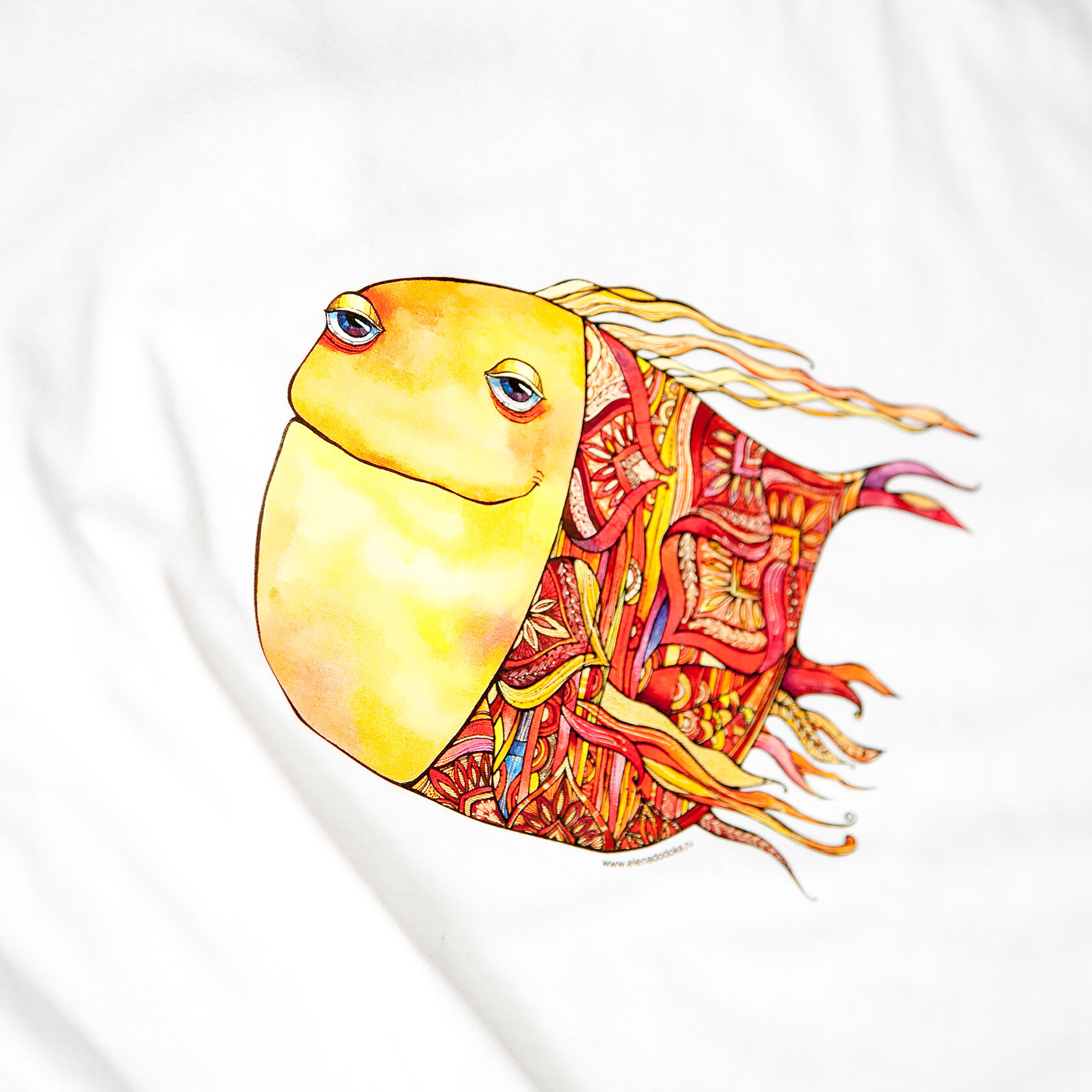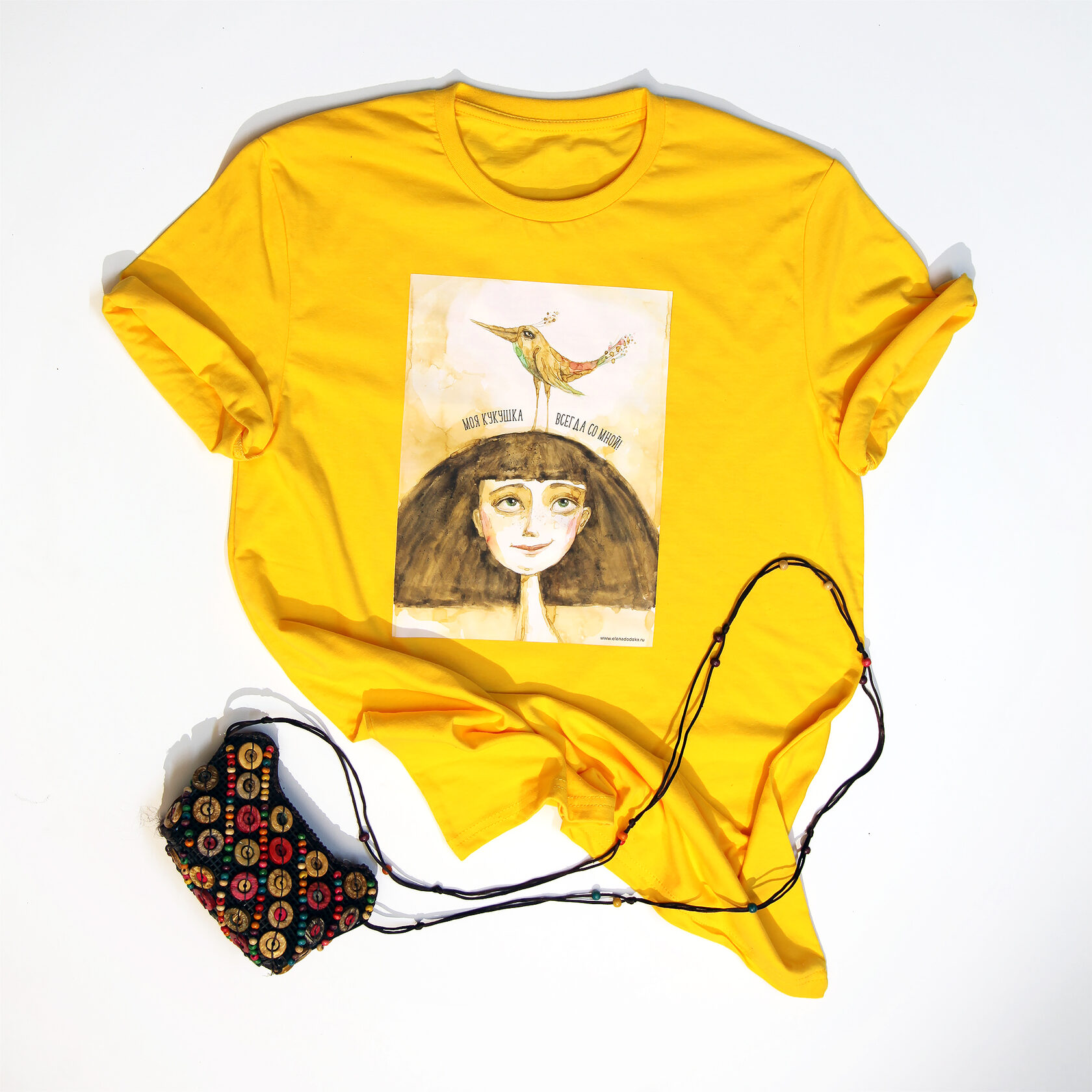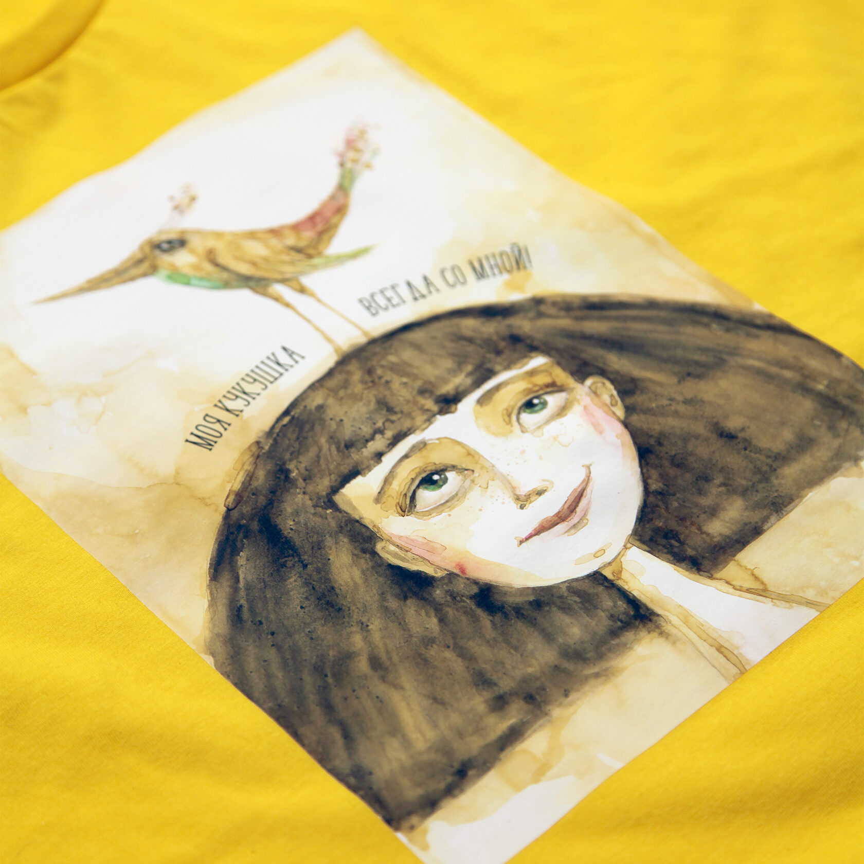 Футболка женская оверсайз (хлопок 100%) с оригнальным принтом, нанесенным на ткань способом DTF печати. Цвет желтый. В продаже размер L. Если вам нужен другой размер или это изображение вы хотите увидеть на другом цвете футболки, пишите мне — все возможно.