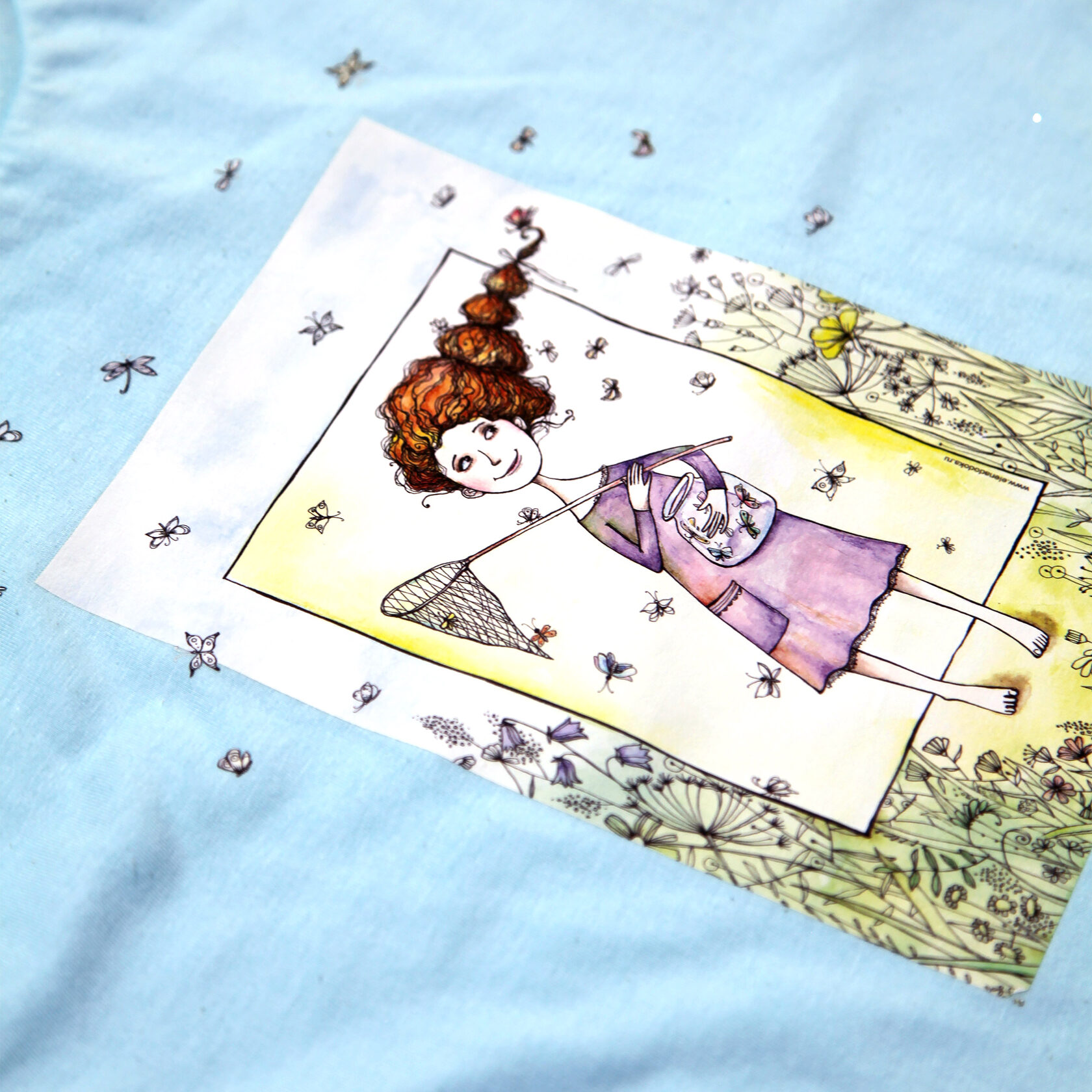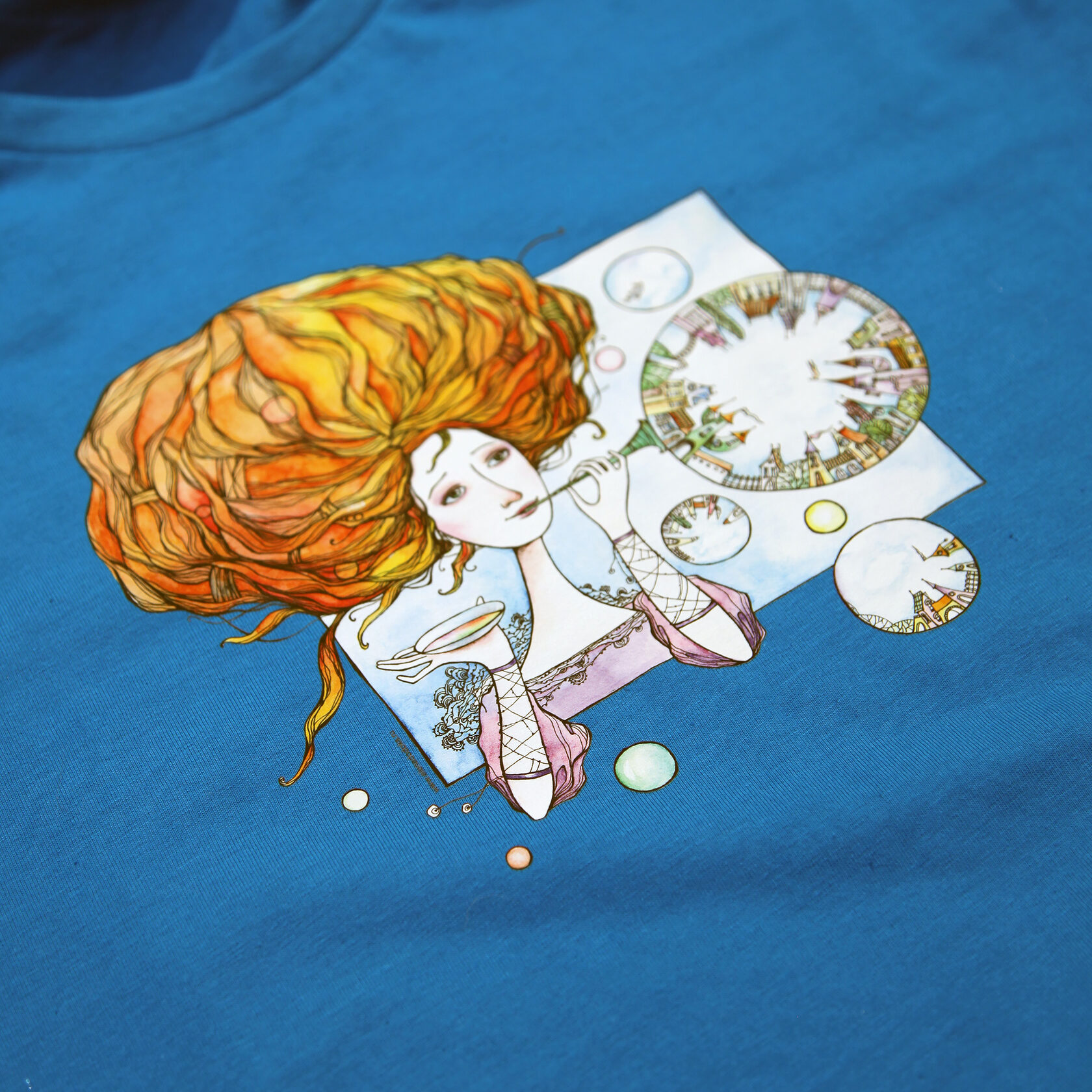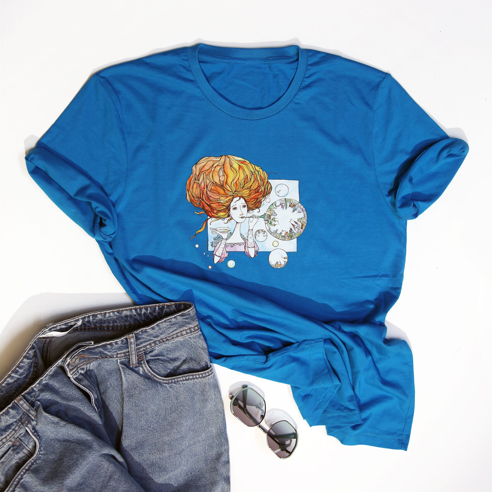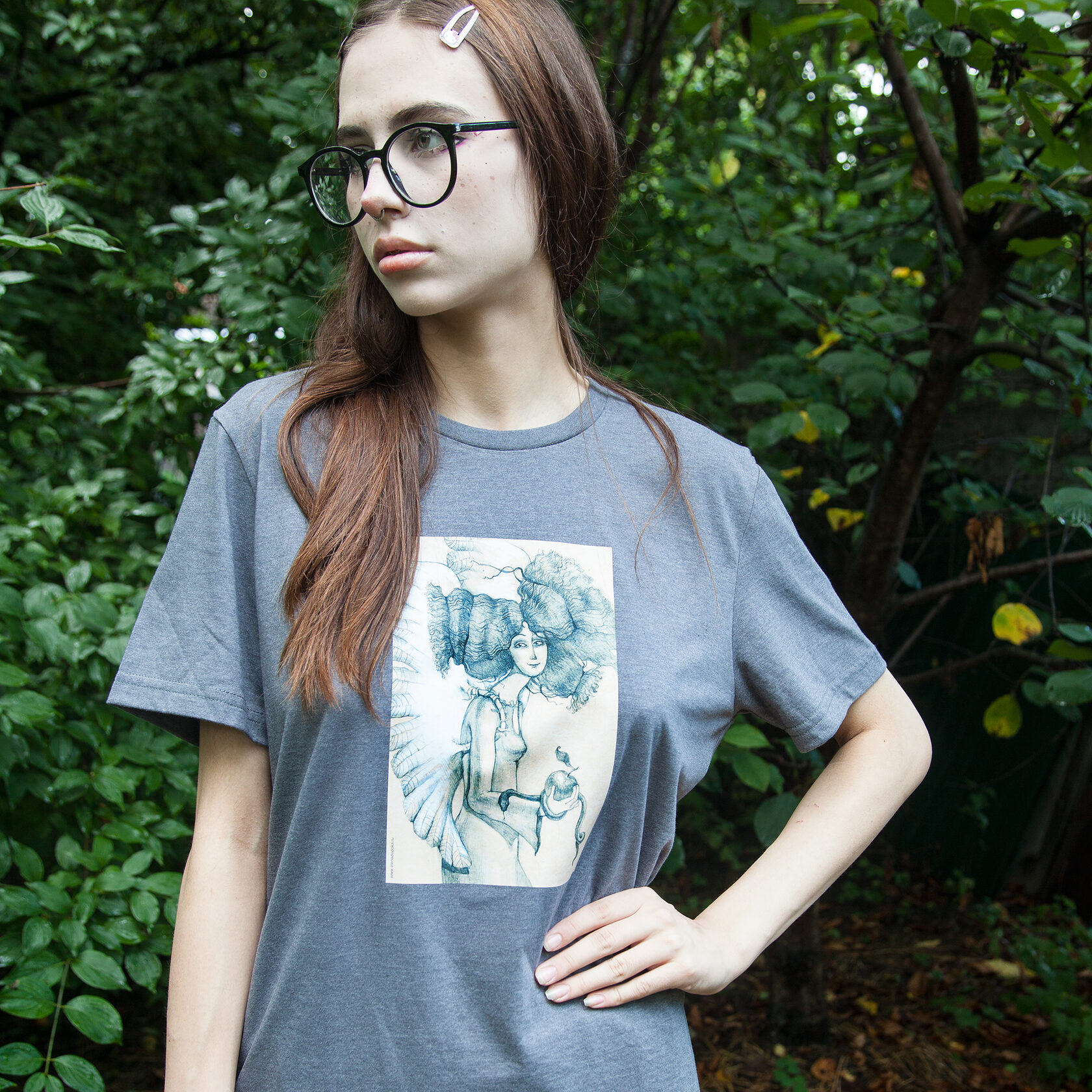 Футболка женская оверсайз (хлопок 100%) с оригнальным принтом, нанесенным на ткань способом DTF печати. Цвет голубой. В продаже размер L. Если вам нужен другой размер или это изображение вы хотите увидеть на другом цвете футболки, пишите мне — все возможно.