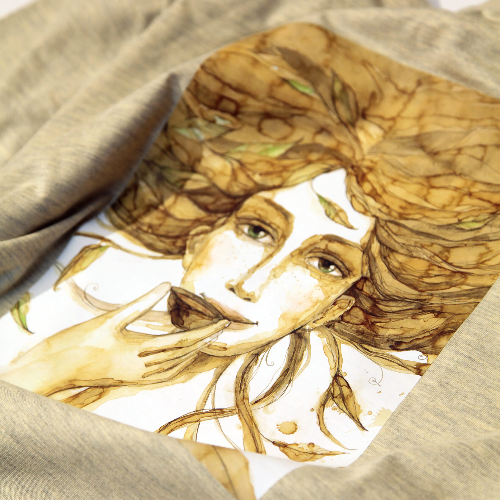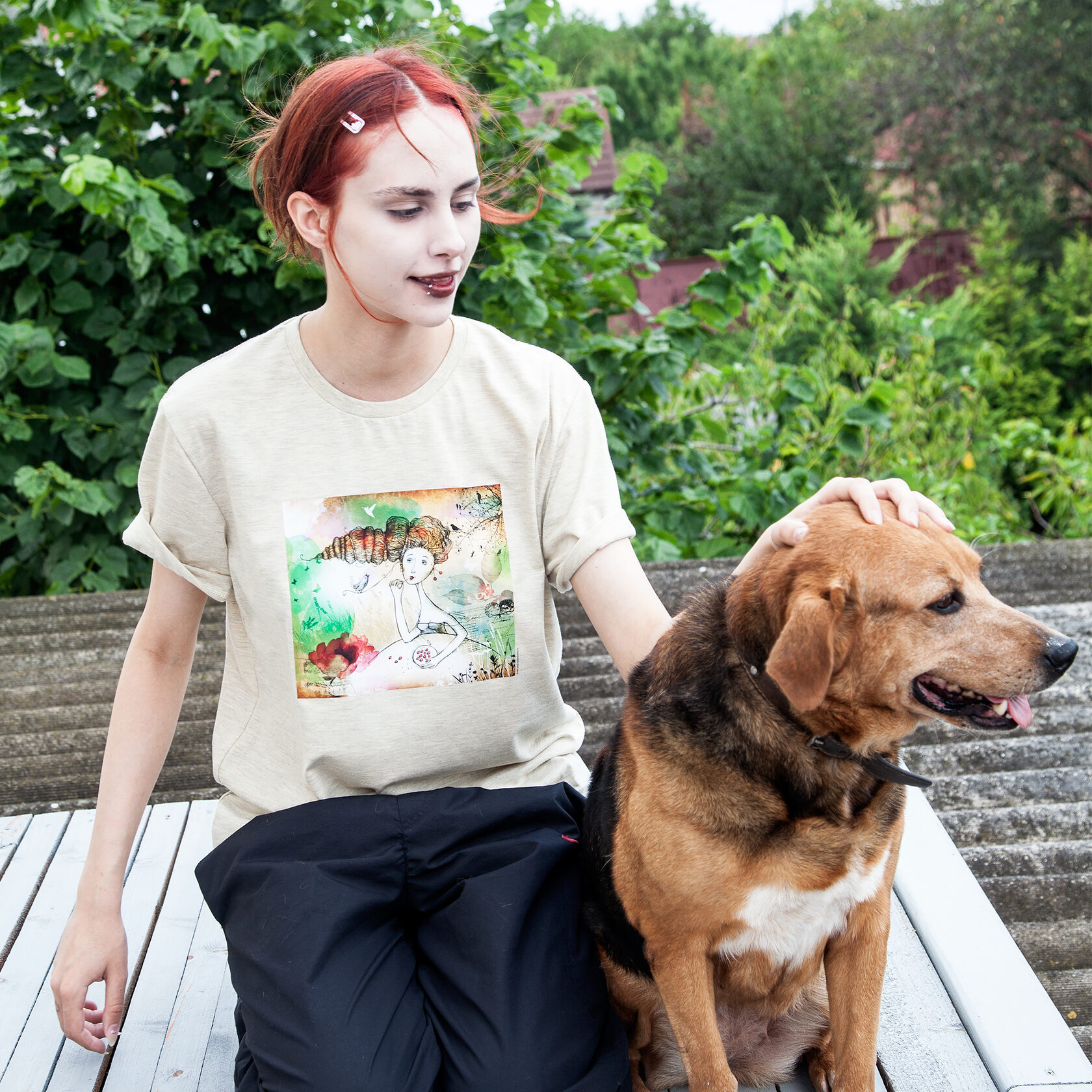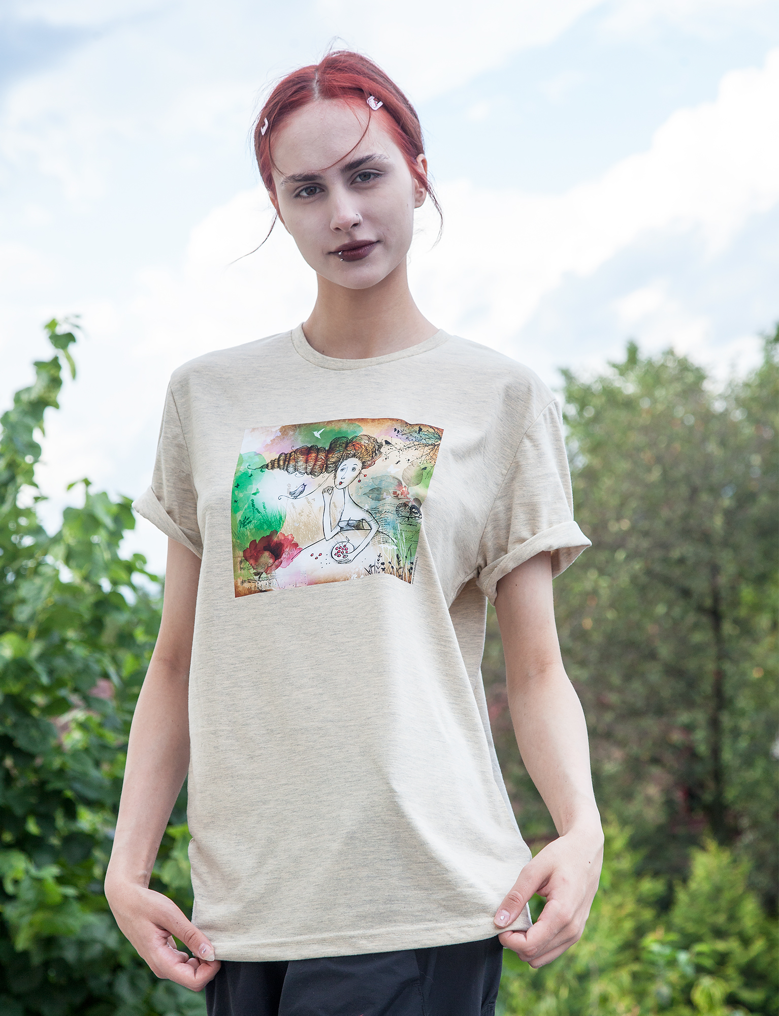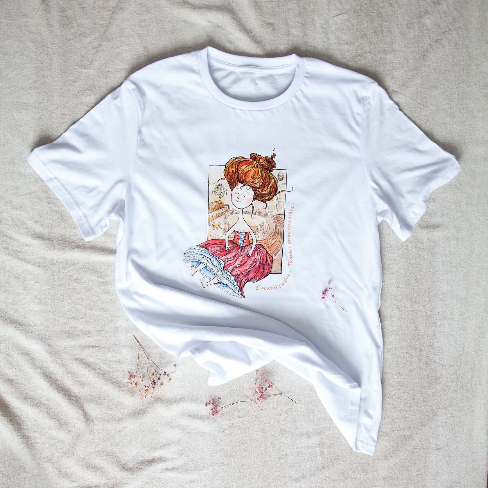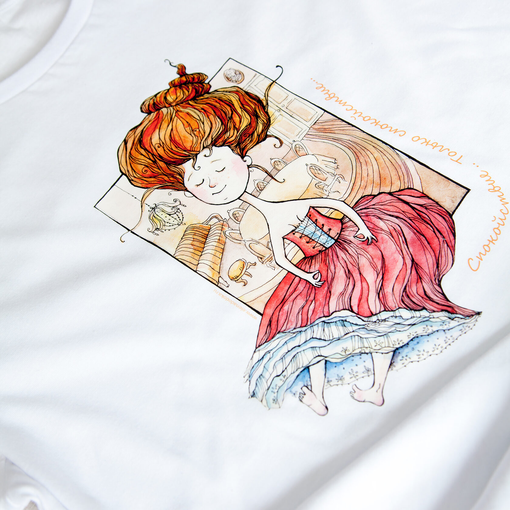 Футболка женская оверсайз (хлопок 100%) с оригнальным принтом, нанесенным на ткань способом DTF печати. Цвет слоновая кость. В продаже размер L. Если вам нужен другой размер или это изображение вы хотите увидеть на другом цвете футболки, пишите мне — все возможно.