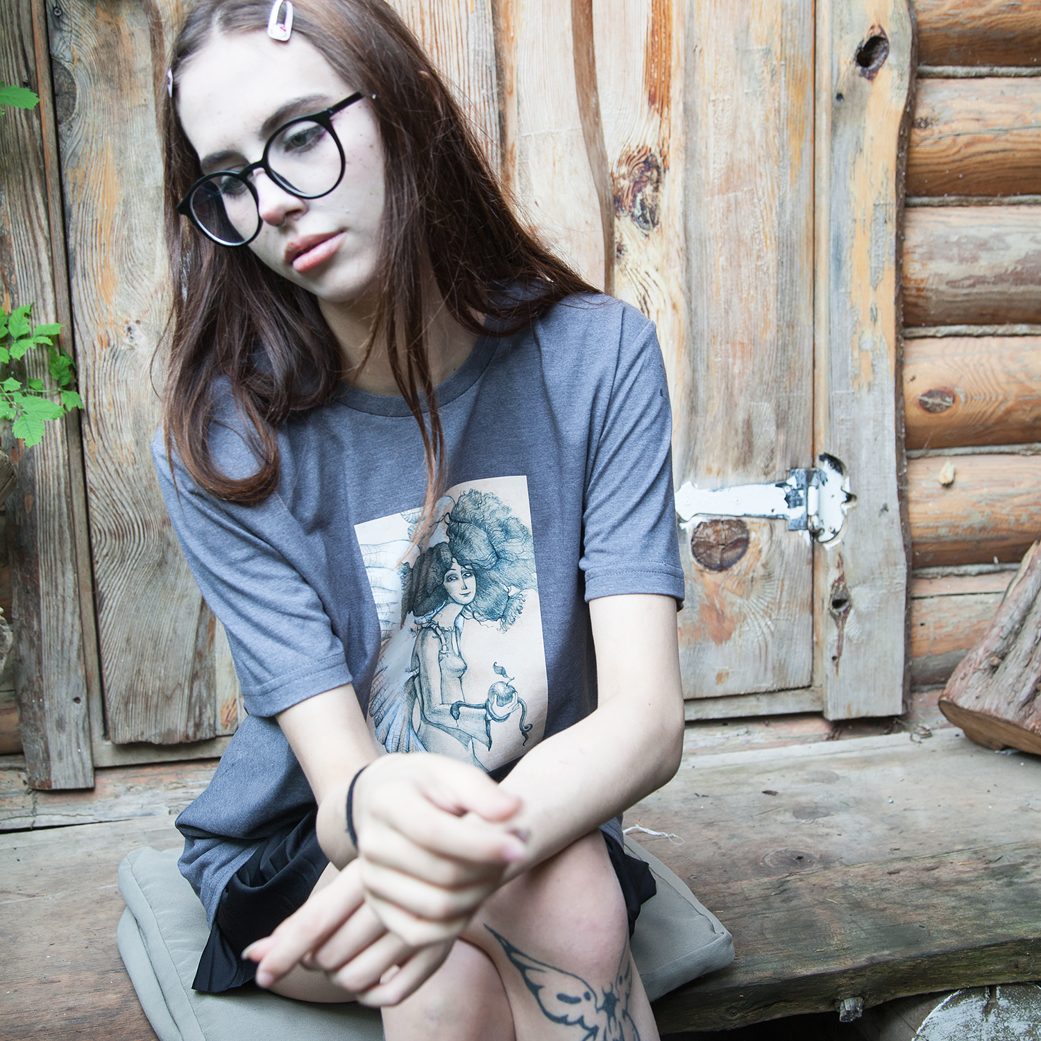 Футболка женская оверсайз (хлопок 100%) серого цвета с оригнальным принтом, нанесенным на ткань способом DTF печати. В продаже размер L. Если вам нужен другой размер или это изображение вы хотите увидеть на другом цвете футболки, пишите мне — все возможно.